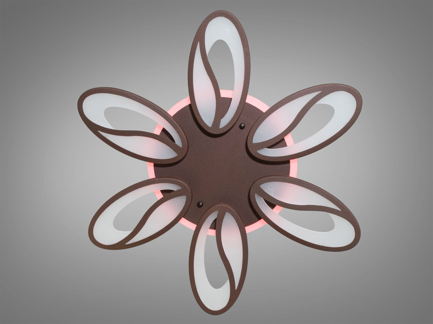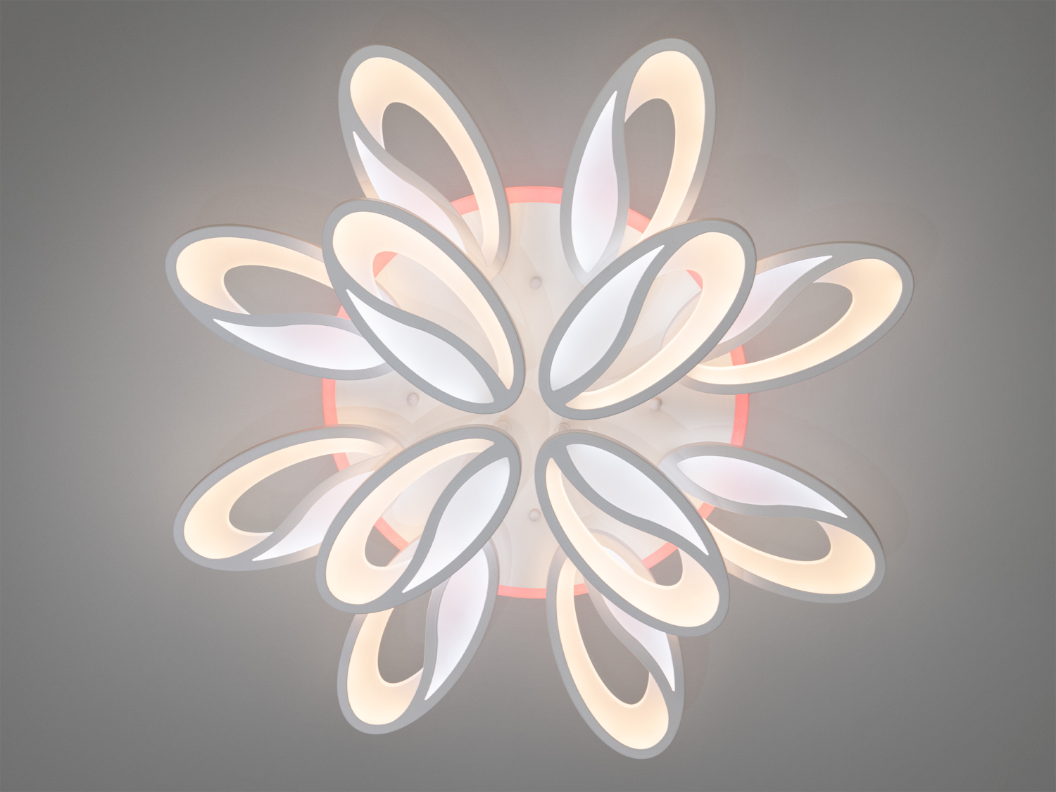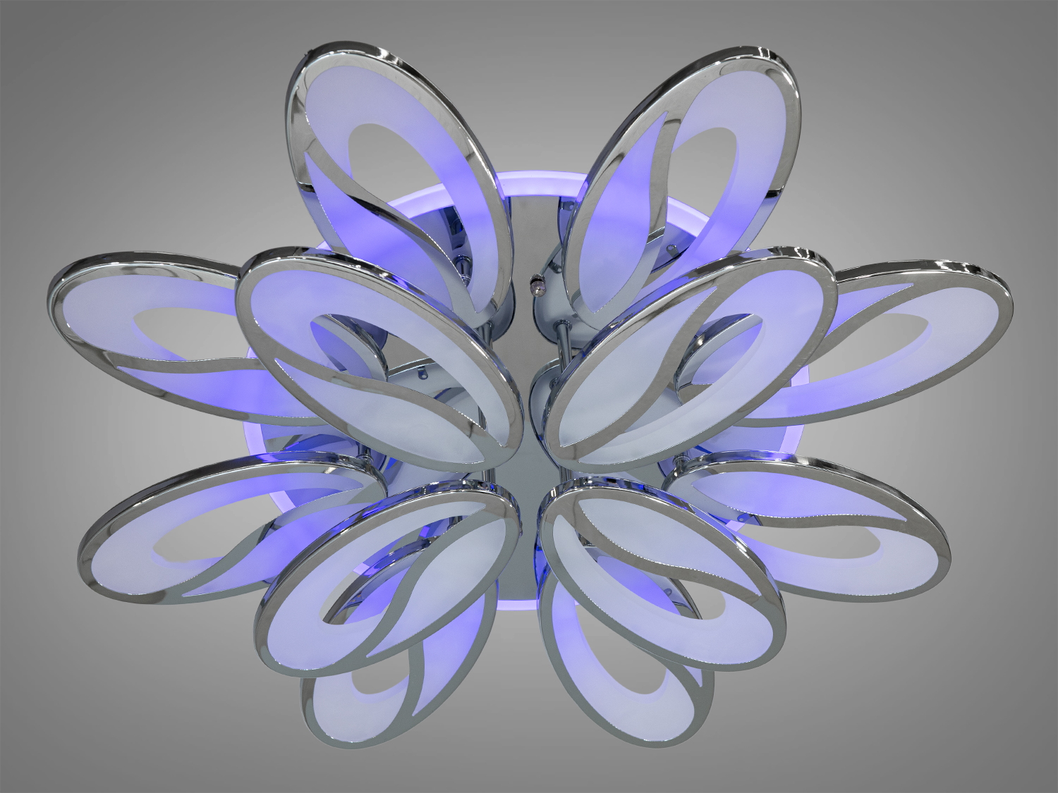 Світлодіодна люстра має кілька режимів: холодний 6400К, нейтральний 4500К, теплий 2700К, кольорове підсвічування, суміщений режим – будь-яке основне світло плюс будь-який колір світлодіодного підсвічування. Регулювання яскравості люстри від 5 до 100% відбувається за допомогою пульта дистанційного керування, що входить до комплекту.