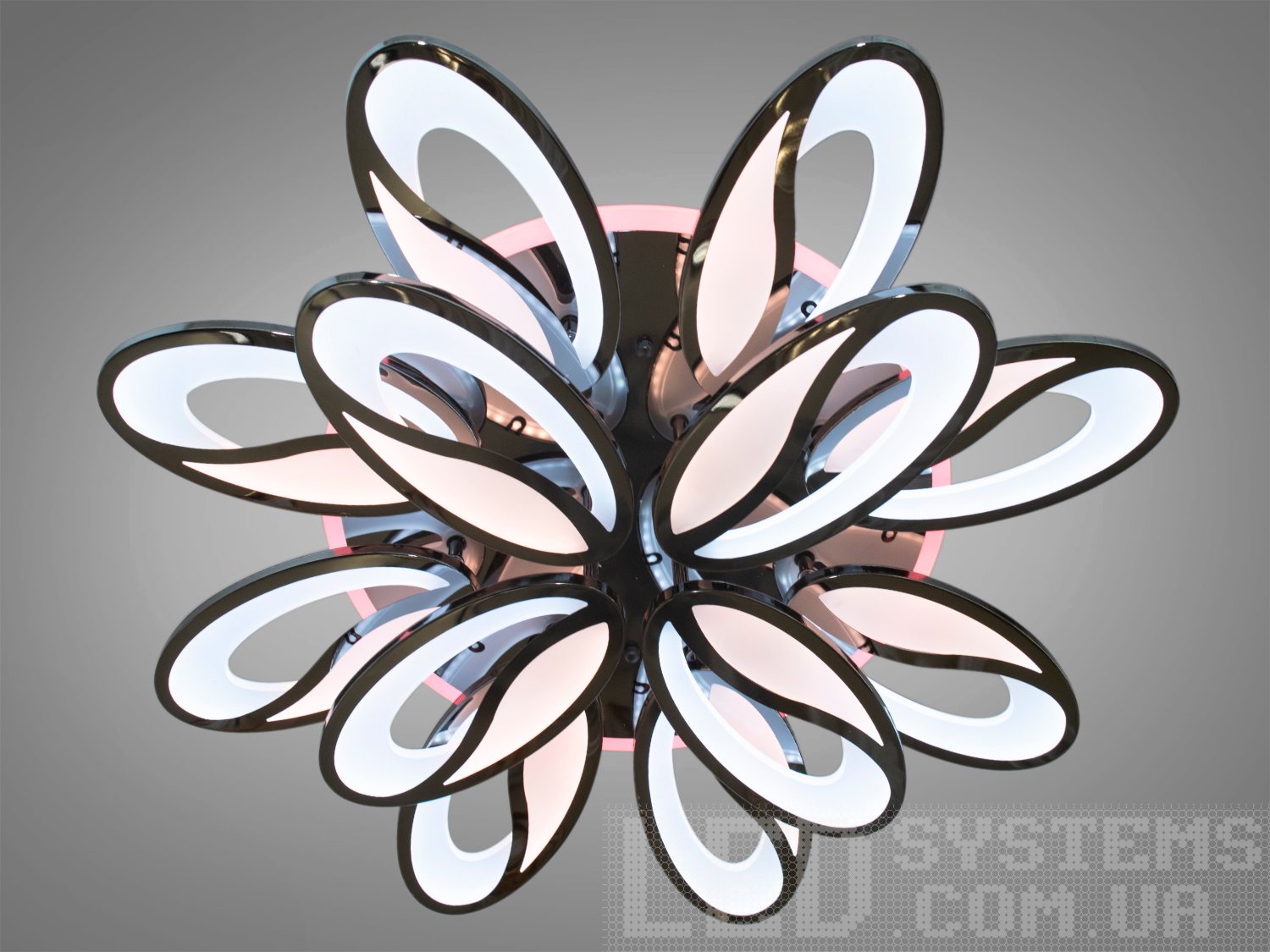 Цікава світлодіодна люстра в спальню з підсвічуванням з диммером, з пультом підходить на площу приміщення приблизно 21 кв.м.