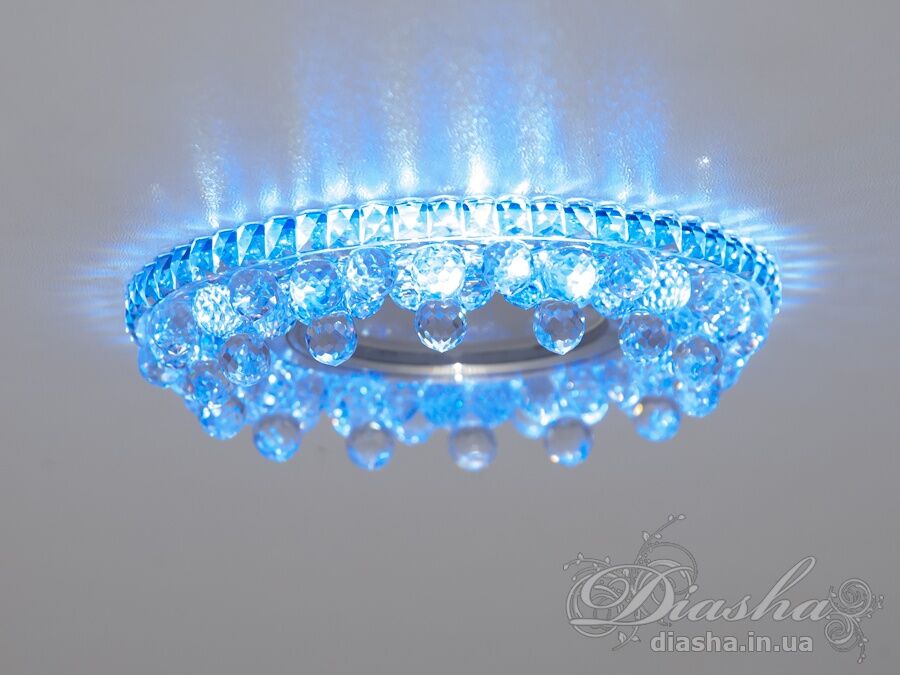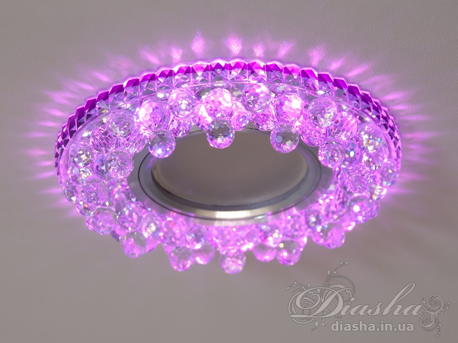 Периметр точкового врізного світильника обрамлений вбудованим LED підсвічуванням потужністю 3 Вт, що створює м′який світловий ореол навколо світильника. Такий ефект додає вишуканості та затишку приміщенню, створюючи неповторну атмосферу. Встановлення точкових світильників по периметру стелі візуально підвищує її та робить простір кімнати більшим і відкритим.