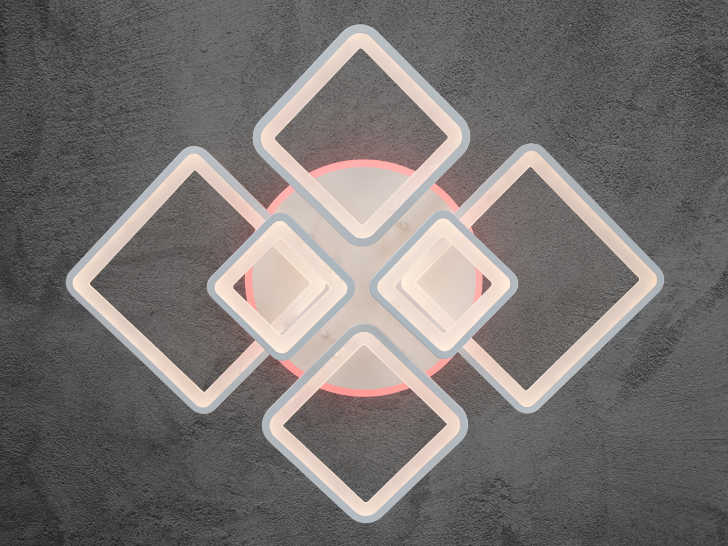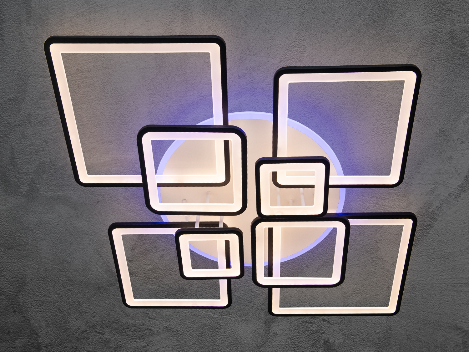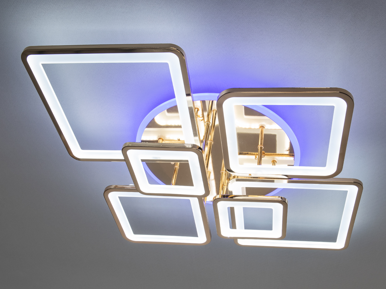 Яскрава LED-люстра для холу з підсвічуванням, золото – це квінтесенція геометричної гармонії та інтелектуального світла. Її форма побудована на каскадній архітектурі квадратів: внутрішні модулі створюють компактне ядро, тоді як зовнішні рамки ніби ширяють навколо, формуючи строгу, але візуально легку світлову конструкцію. Люстра буквально вписана в простір як цифровий знак або фрагмент абстрактної матриці.