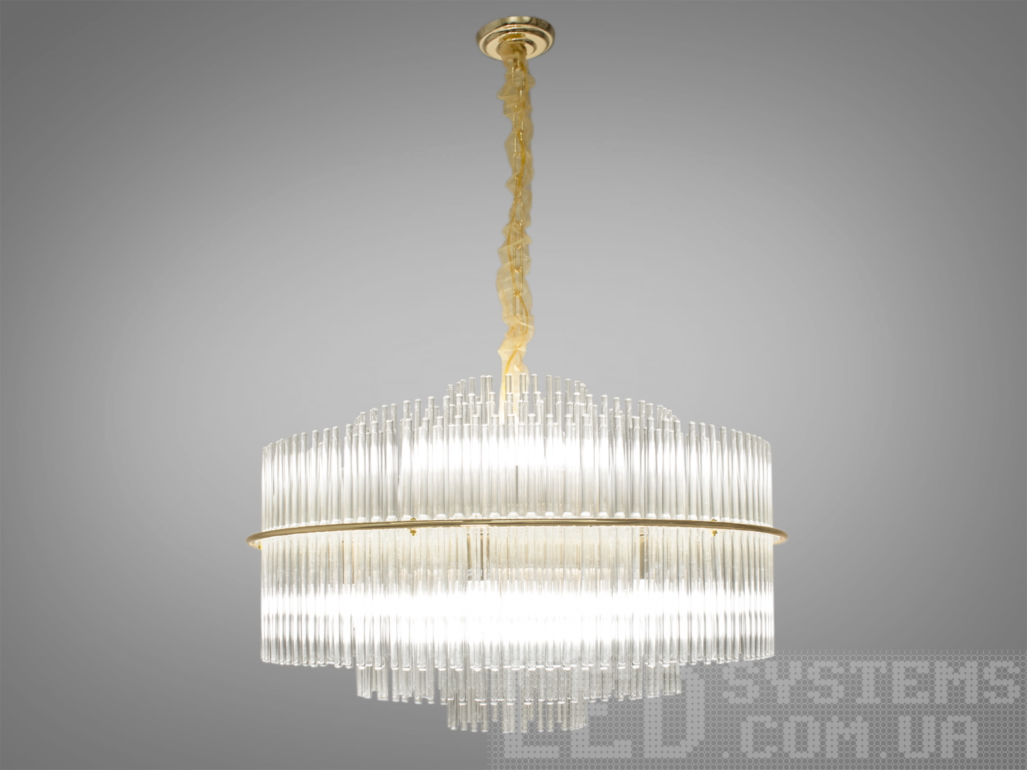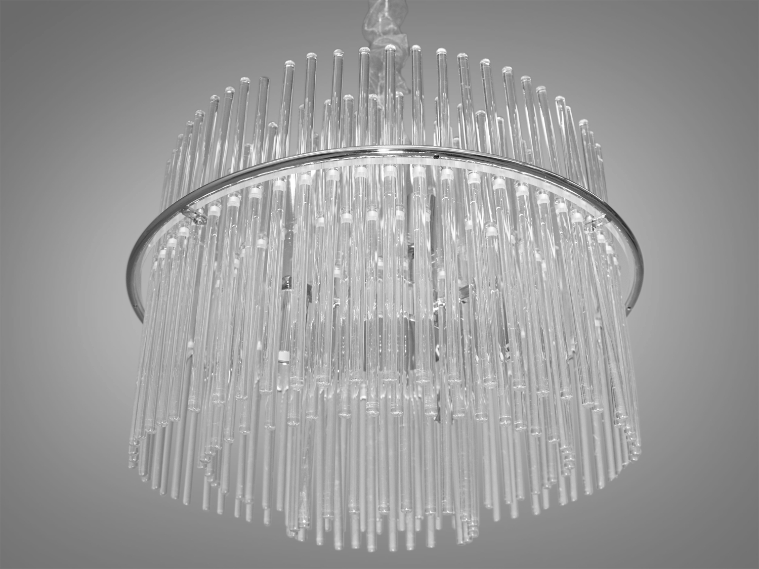 Дизайн люстри створює відчуття парячих у повітрі скляних паличок. Непомітний каркас підтримує їх, зберігаючи їхню легкість і дозволяючи світлу проникати через прозорі скляні елементи, заповнюючи простір м'яким та приємним світлом.