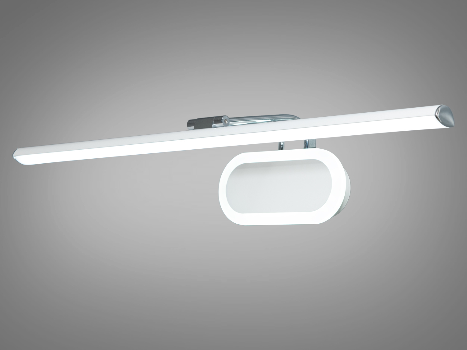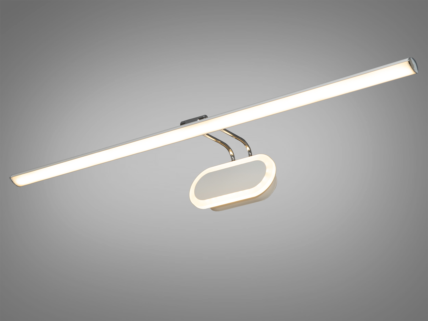 Біла металева основа овальної форми, з підсвічуванням по контуру, створює ефект плавності та легкості. Хромований тримач плафона додає світильнику сучасного вигляду, а білий колір з акриловим розсіювачем забезпечує рівномірне та ненав'язливе світло, що ідеально підходить для акцентування важливих елементів інтер'єру без створення сліпучого ефекту.