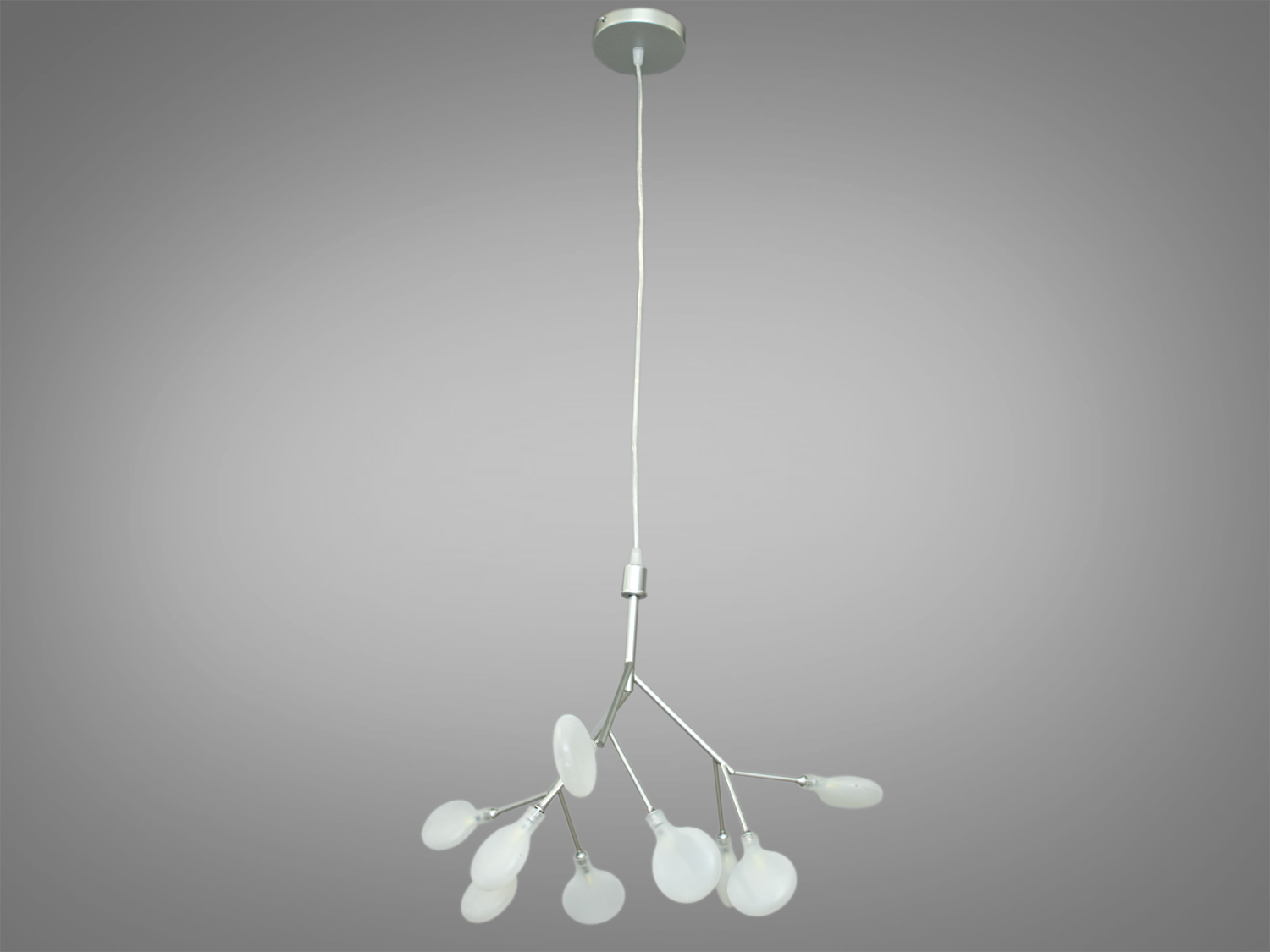 Люстра нагадує гілку з рівномірно розміщеними скляними плафонами у формі прозорих куль, які м’яко розсіюють світло, створюючи комфортну атмосферу без зайвої яскравості. Сатиновано-хромована поверхня каркаса надає виробу сучасного вигляду, підтримуючи легкість і повітряність конструкції.