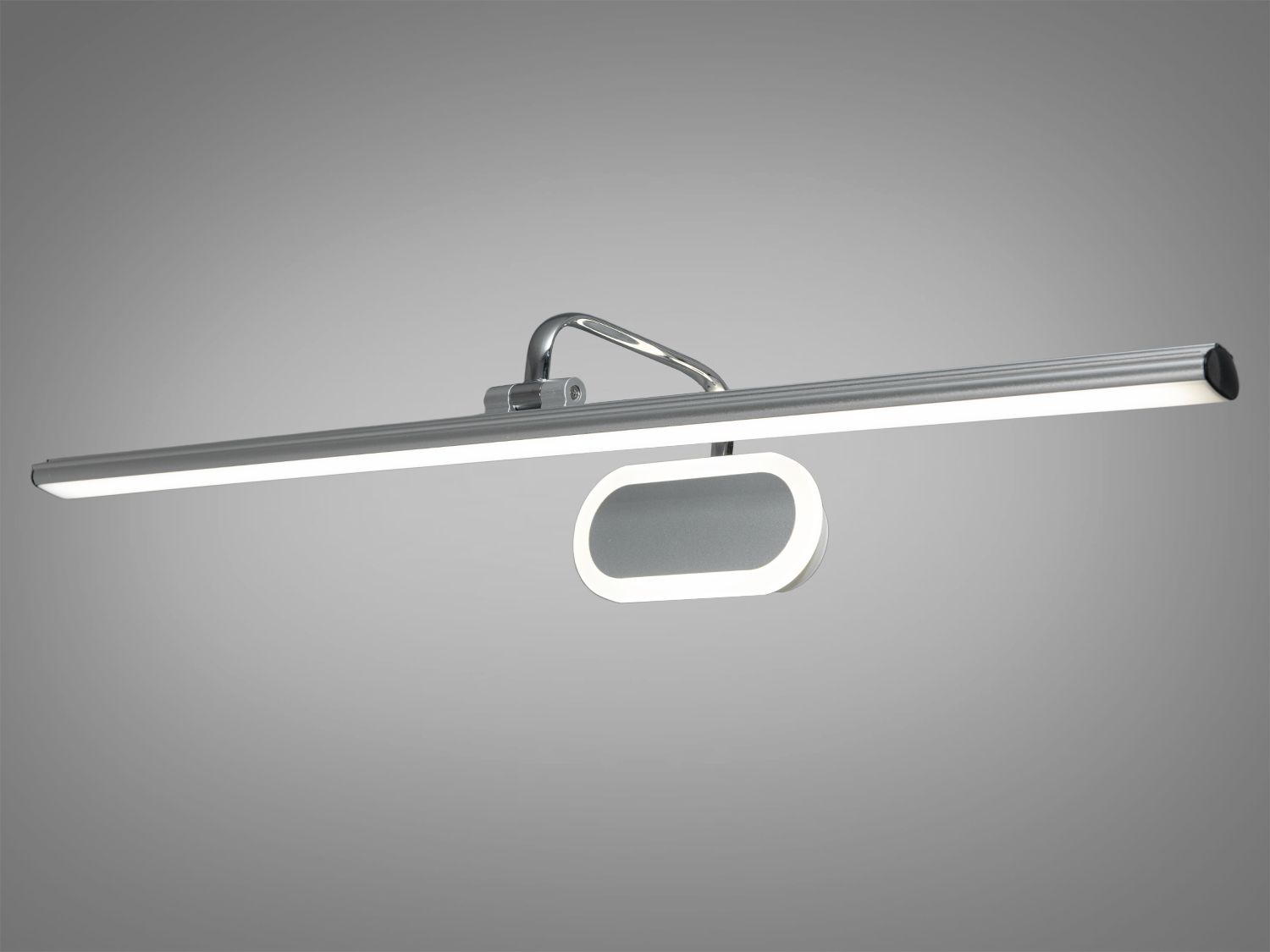 Хромований тримач плафона, увінчаний акриловим розсіювачем, із чорними фіксаторами на краях, інтегрує в себе сучасний відтінок мінімалізму і нев'янучу класику. Це поєднання забезпечує ідеальне освітлення для акцентування на дзеркалах, картинах, та інших елементах інтер'єру, надаючи їм особливого значення і художньої вартості.