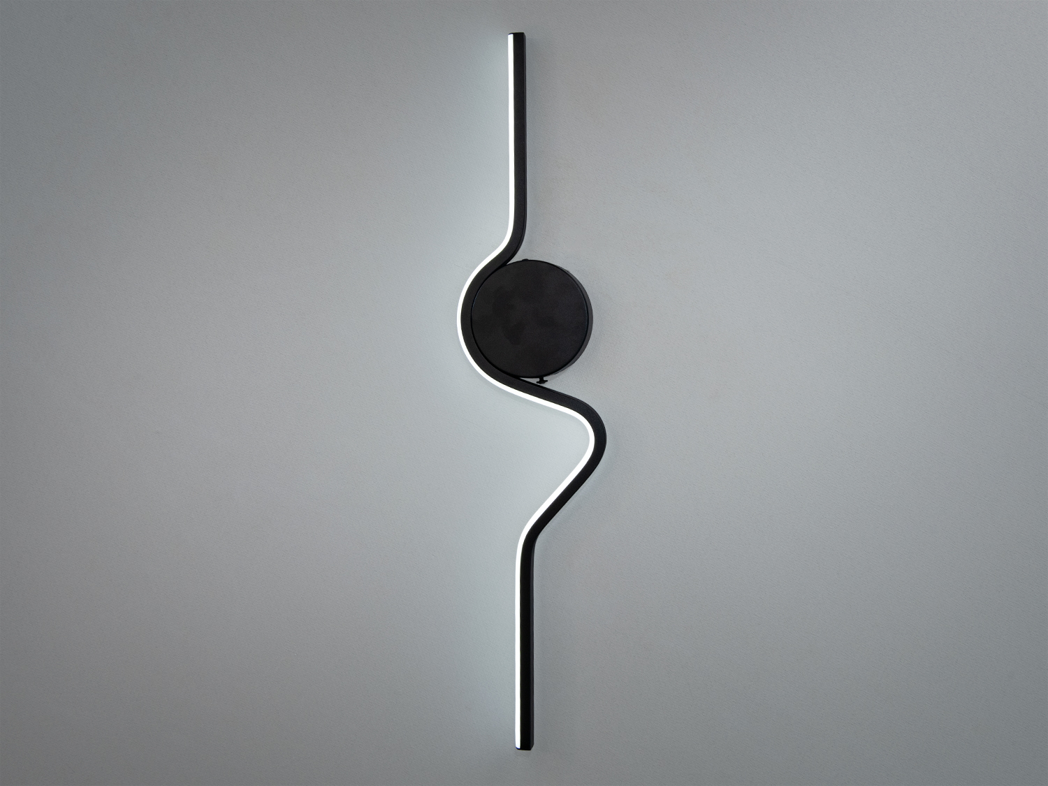 Це бра – справжній шедевр геометричної простоти. Тонка лінія світла, що проходить по плавному вигину, створює м'яке свічення, яке обрамляє простір, надаючи йому унікального характеру. Центральний чорний елемент додає контраст, посилюючи ефект мінімалізму.