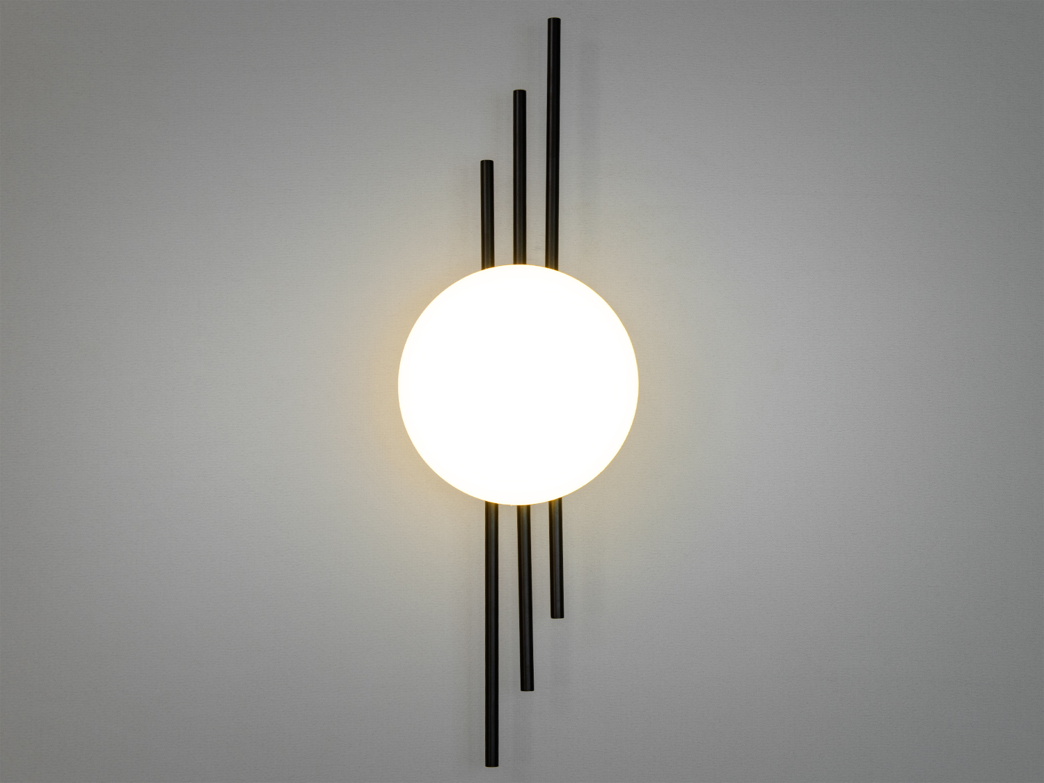 Головним акцентом світильника є ідеальна біла куля, що символізує місяць або ніжне сяйво перлів, що підтримується золотистими металевими лініями, що нагадують струни або сонячні промені. Ця композиція надає бра витонченого та скульптурного вигляду.