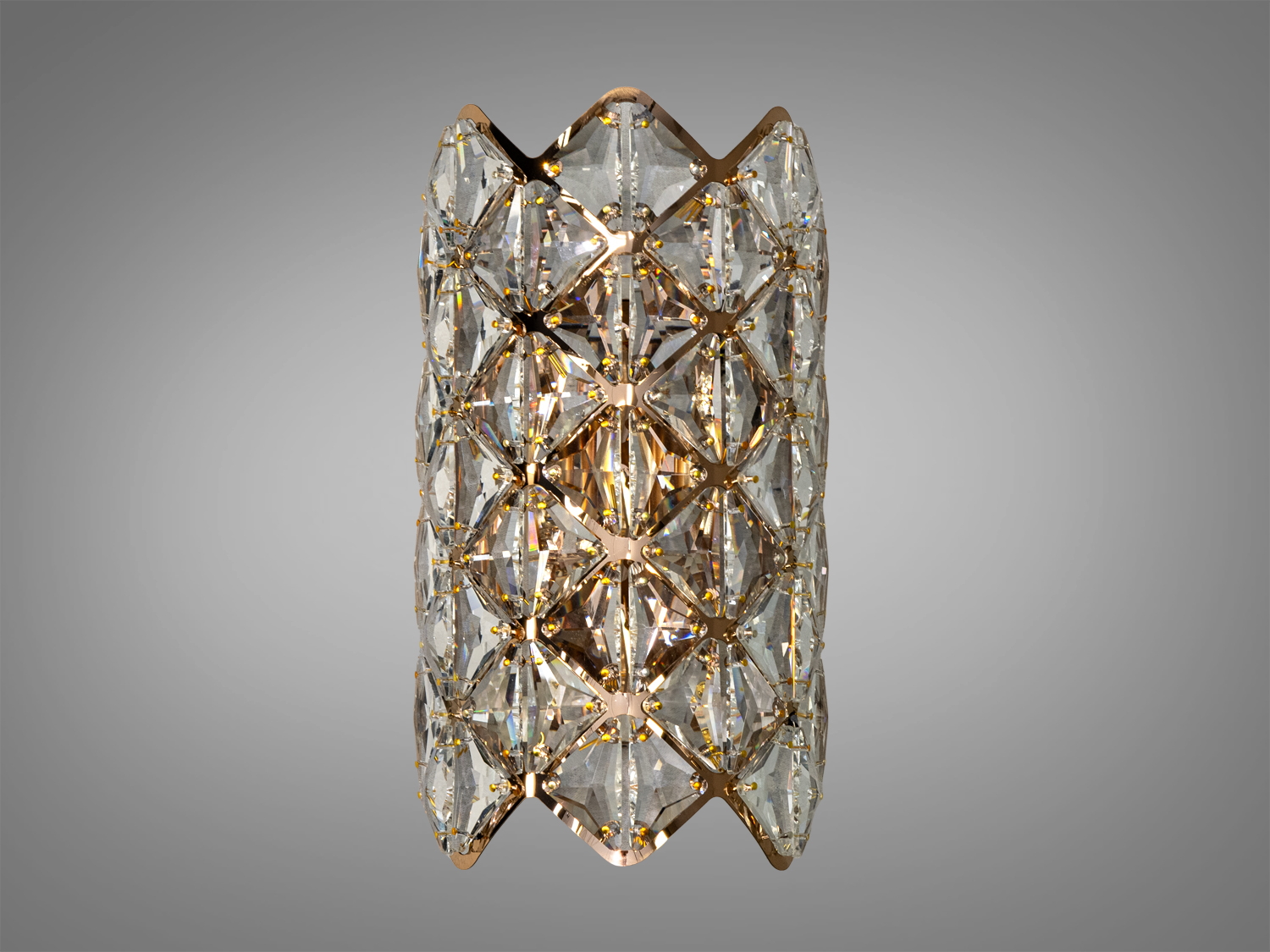 Дизайн бра вражає своїми кришталевими елементами у формі ромбів, що відбивають світло і створюють унікальну гру освітлення. Золотиста основа додає елементу розкішний вигляд, що робить його справжньою окрасою.