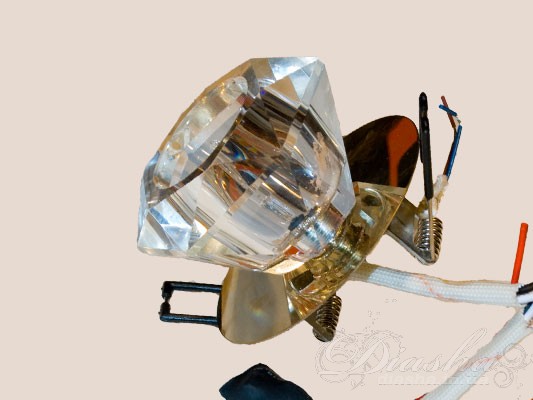 Середина світильника оснащена лампою, що випромінює світло через прозору центральну секцію, надаючи глибини та яскравості кольоровим фасетам. Колірні відтінки світильника варіюються від теплих золотистих до багатих фіолетових тонів, створюючи різнобарвне світлове шоу в приміщенні.