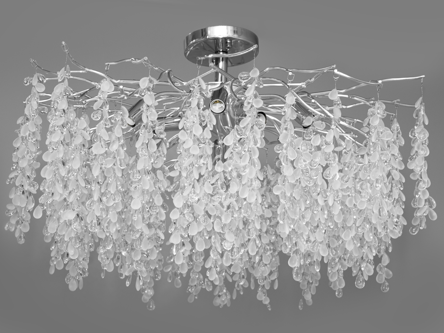 Ексклюзивна кришталева люстра "Гліцинія" в спальню є квінтесенцією розкоші та сучасного дизайну, яка зливається у гармонійну симфонію світла та мистецтва. Вона ніби виросла з самої природи, хромовані алюмінієві гілки обвиваються навколо, підтримуючи каскади кришталів, що іскряться, що нагадують квітучу гліцинію. Застосовується у вітальню, спальню, для залу, для холу, на кухню студію.