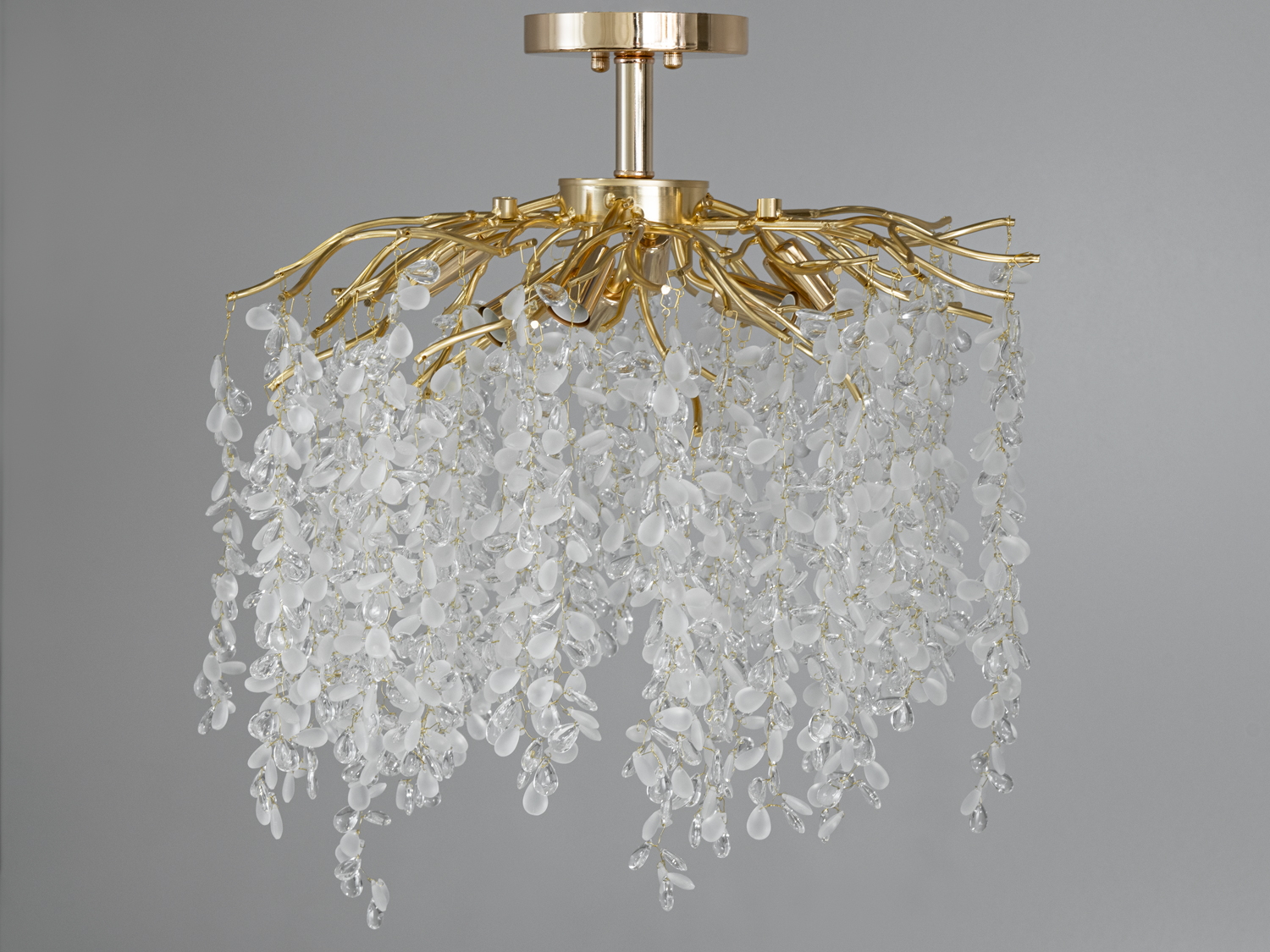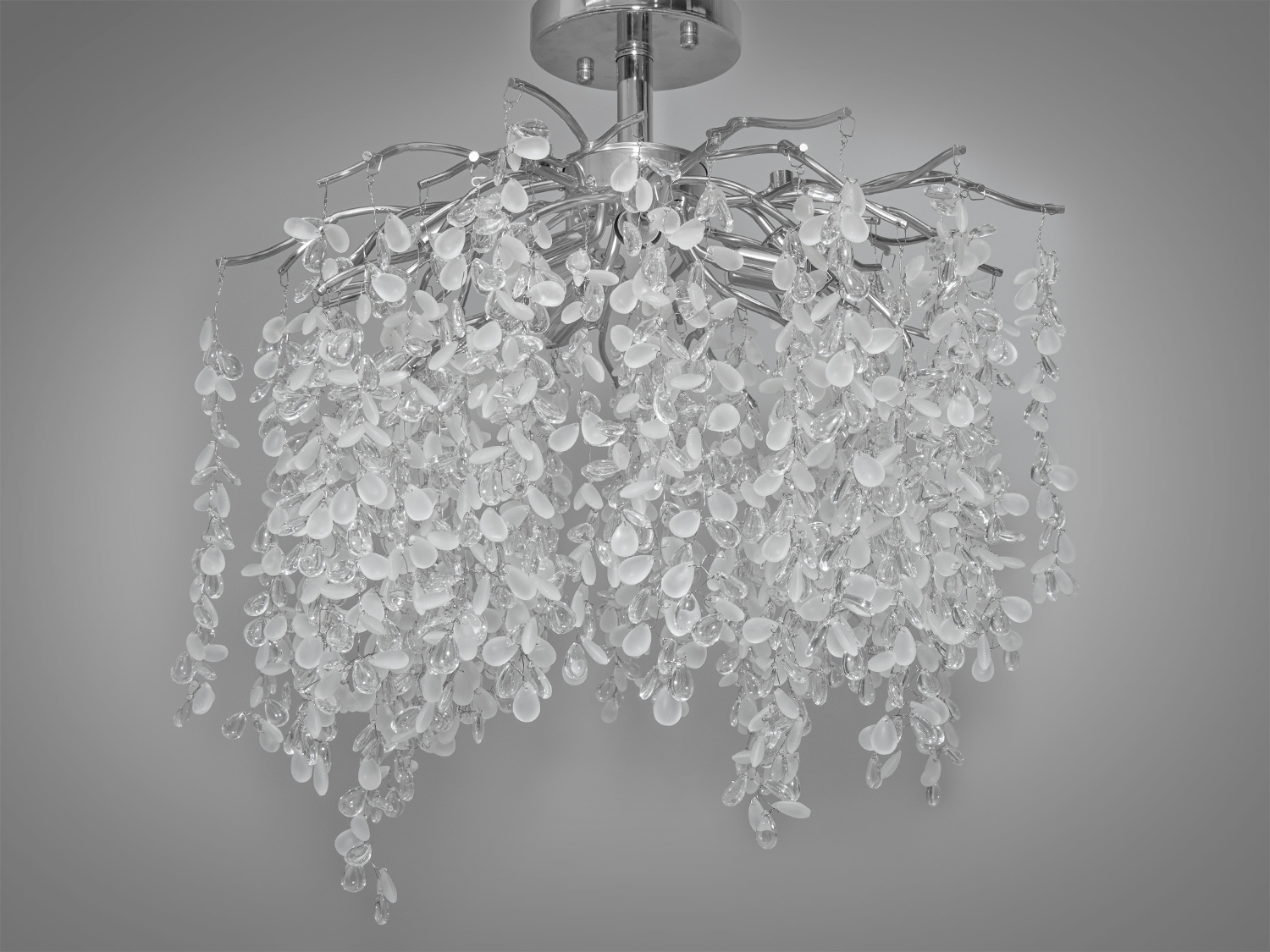 Кожен кришталь цієї люстри, відрізняючись формою і розміром, вловлює світло і розсіює його на всі боки, створюючи ілюзію природного водоспаду, що м'яко висвітлює простір. Особливість цієї моделі – у її здатності відтворювати дивовижну гру світла, що змінюється з кожним кутом зору, надаючи інтер'єру динамічність та жвавість.