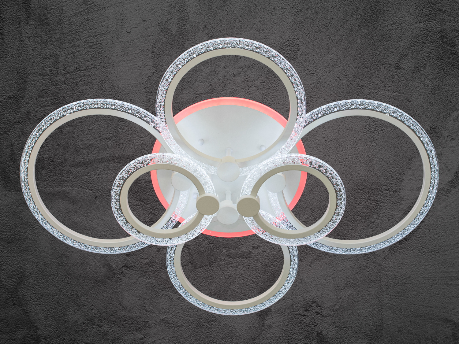 Світлодіодна люстра має кілька режимів: холодний 6000К, нейтральний 4100К, теплий 3200К, кольорове підсвічування, суміщений режим – будь-яке основне світло плюс будь-який колір світлодіодного підсвічування. Регулювання яскравості люстри від 5 до 100% здійснюється за допомогою пульта дистанційного керування, що входить до комплекту.