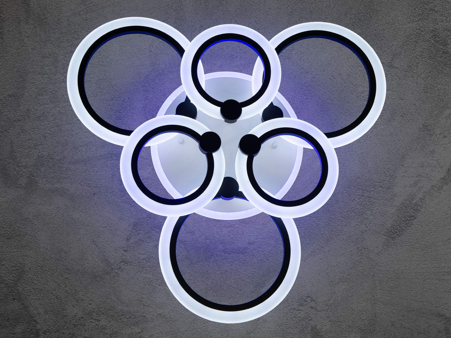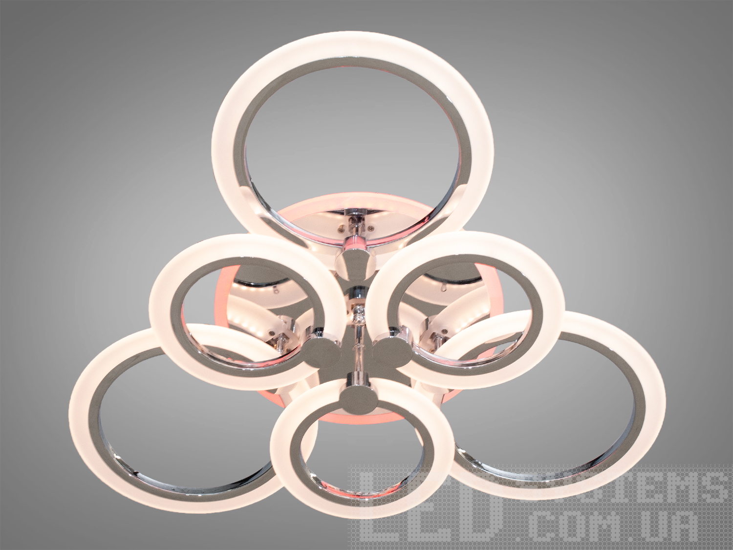 Світлодіодна люстра з колами в зал з димером, з пультом, з LED-підсвіткою підходить на площу приміщення приблизно 16 кв. м. Люстра світить яскраво, але не сліпить завдяки матеріалу — акрилу, до того ж цей матеріал дуже міцний — його важко пошкодити. Підходить для залу, вітальні, спальні, дитячої, позаяк немає скляних елементів.