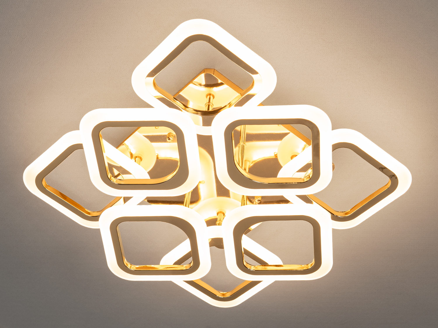 LED люстра в передпокої з пультом - це вишуканий зразок сучасного освітлення, в якому геометрія поєднується з благородним сяйвом. Її конструкція побудована на п′яти квадратних модулях, що м′яко закруглені по краях і вибудовані в симетричну композицію. Центральний елемент, встановлений на трохи піднятій осі, надає конструкції об′єм, створюючи ефект «світу, що ширяє». Особливу увагу привертає благородний золотий відтінок основи та внутрішніх граней квадратів – він додає інтер′єру витонченості, статусу та тепла.