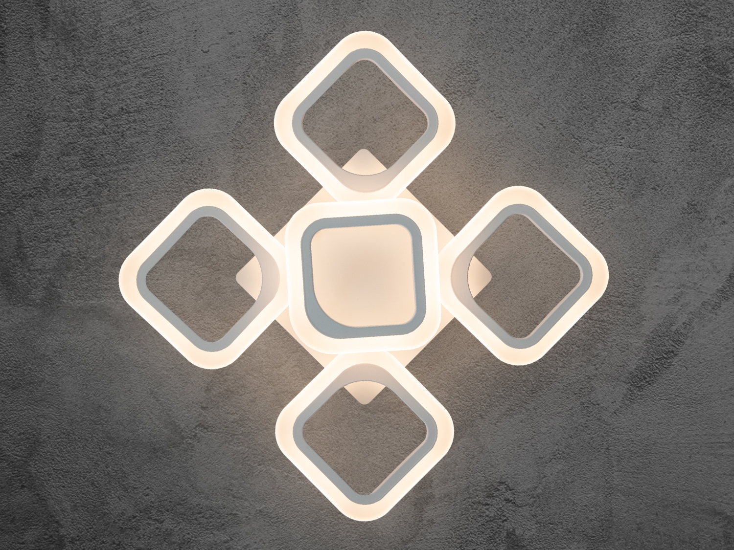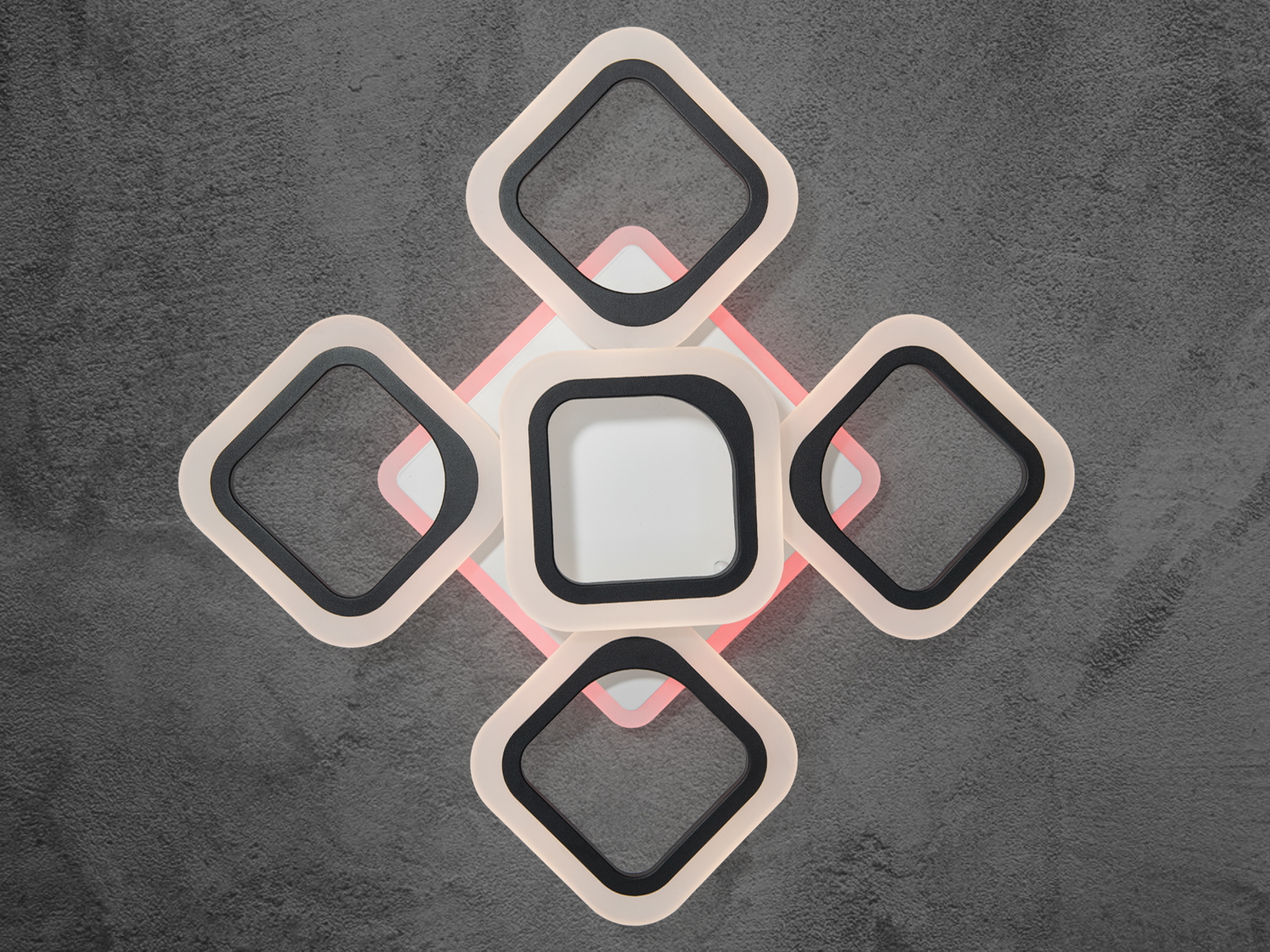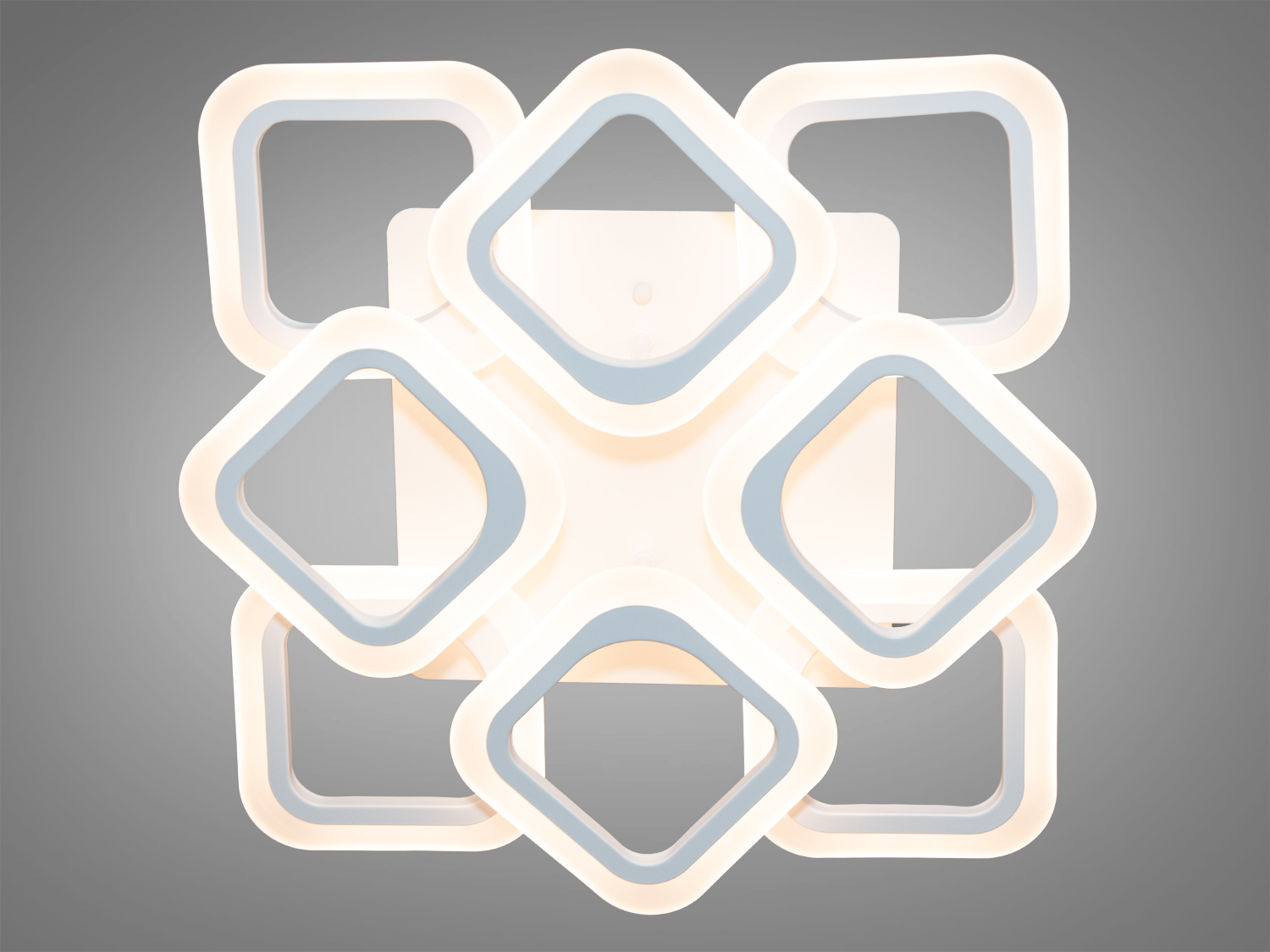 Світлодіодна люстра в дитячу з диммером - це візуально багатошарова світлова композиція, що ніби застигла в моменті руху. Її футуристична геометрія побудована на зміщених квадратах із заокругленими кутами, що створює ефект динамічного світла та тіні навіть у вимкненому стані. Немов пелюстки цифрової квітки, вісім рамок, що світяться, розташованих на різних рівнях і з легким зміщенням, формують об'ємну і гармонійну структуру.