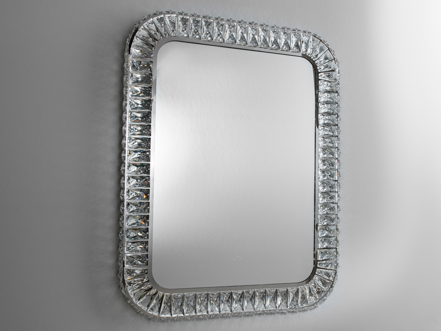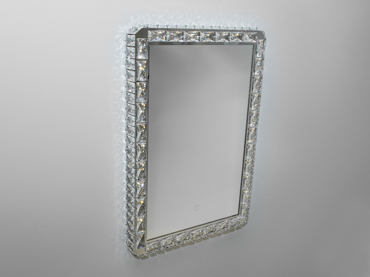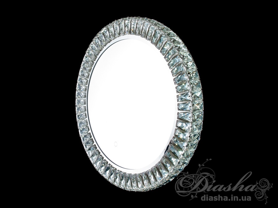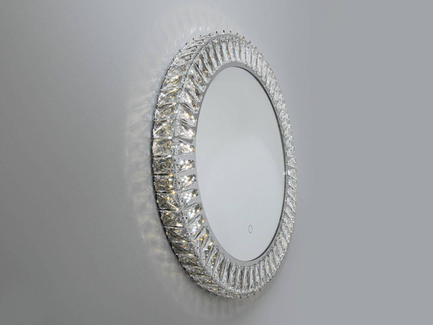 Дзеркало з вбудованою світлодіодним підсвічуванням вирішує відразу 2 проблеми стоять при підборі дзеркала. По-перше, зовнішній вигляд. Дзеркало стає не просто сірим і невиразним предметом інтер'єру, а яскравою блискучою родзинкою у вашому передпокої або санвузлі, та ще й з багатющим функціоналом. По-друге, власне функціонал - дзеркало оснащено вбудованим підсвічуванням по всьому периметру. Підсвічування, як і практично у всіх сучасних світлодіодних люстрах здатна змінювати температуру світіння: теплий - холодний - нейтральний. Але на відміну від люстр в дзеркалі не потрібен пульт. Більш того немає потреби в кнопках для вибору режиму, а вони у інших виробників хоч і повинні бути влагозахистний, але досить часто можуть "полоскотати" мережевим напругою. У наших дзеркалах управління здійснюється за допомогою сенсорного управління вбудованого в саме скло дзеркала. Щоб увімкнути або вимкнути підсвічування досить доторкнутися на секунду до скла в районі кільця, що світиться, для зміни кольору зробити коротке натискання, якщо ж затримати палець на склі то яскравість почне плавно спадати, а потім також плавно наростати. Варто тільки відвести палець від дзеркала і яскравість світлодіодного підсвічування зафіксується на обраному рівні. Завдяки високоякісному кришталю світло випромінюється рівномірно, не створюючи яскравих відблисків на обличчі, в той же час на стіні навколо дзеркала створюється легкий іскристий візерунок, який створює візуальне відчуття, що дзеркало ширяє в повітрі.