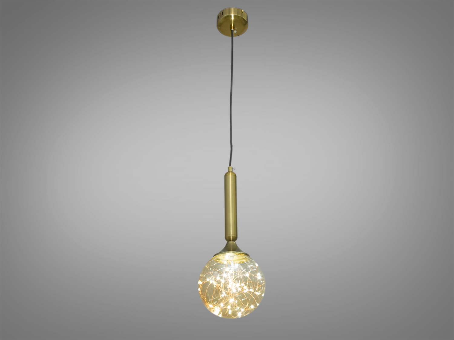 Як джерело світла в цьому підвісі використовується незвичайна світлодіодна стрічка, виконана у вигляді мідних зволікань з припаяними світлодіодами. Сувора форма плафон об'єднує з хаосом стрічки всередині нього. Підвіс світиться тисячею вогників - начебто бризки шампанського або іскри від бенгальських вогнів застигли всередині скляної сфери. За рахунок цього виходить м'яке розсіяне світло.