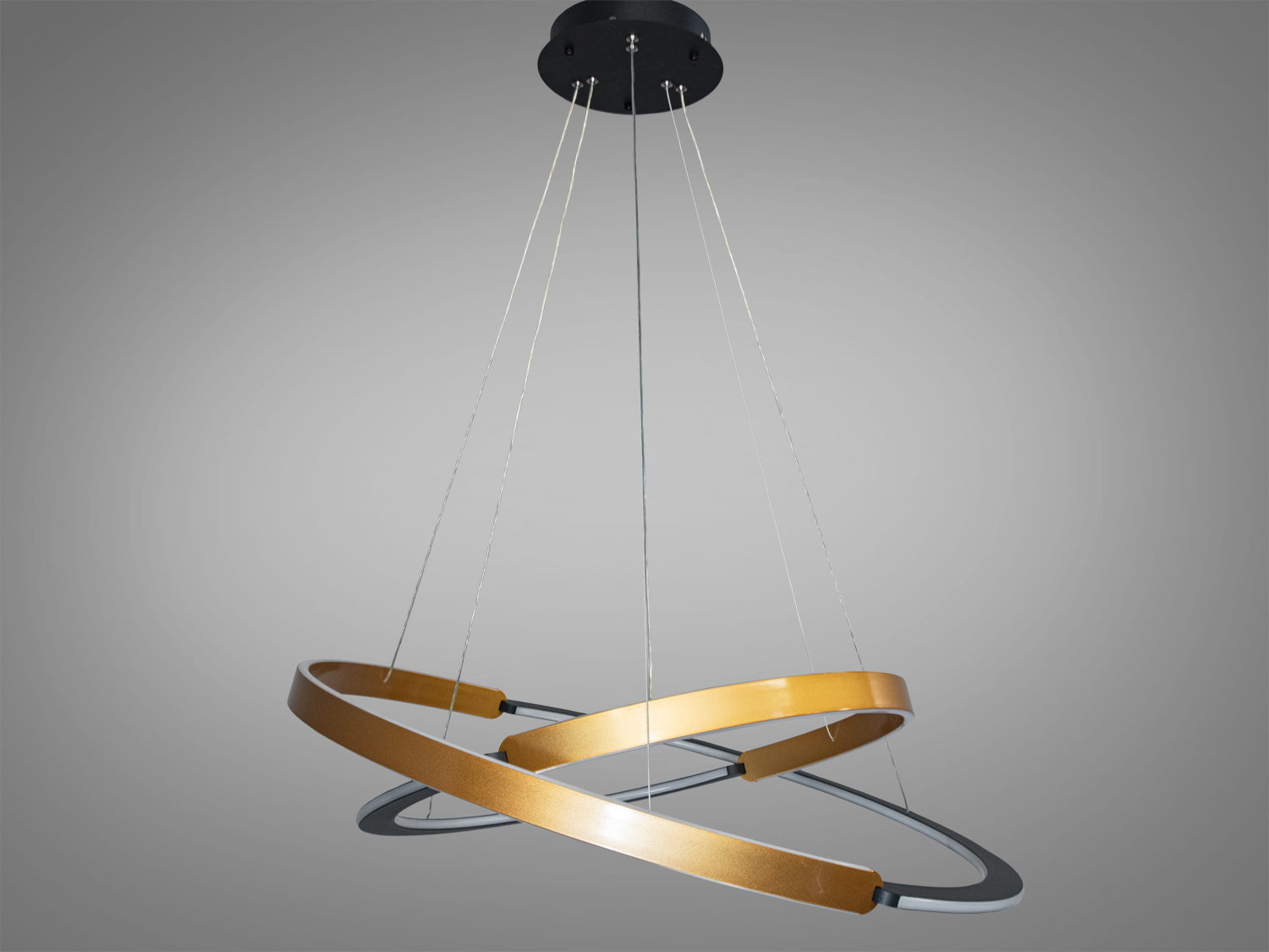 Матовий золотий обід зовні та чорне внутрішнє покриття надають моделі благородної контрастності. Вбудовані по внутрішньому колу LED-джерела формують м'яке, рівномірно розсіяне світло, комфортне як для робочої обстановки, так і для розслаблюючої атмосфери. Кріплення на монтажну планку забезпечує надійність, а довжина підвісу, що регулюється, — гнучкість у розміщенні.