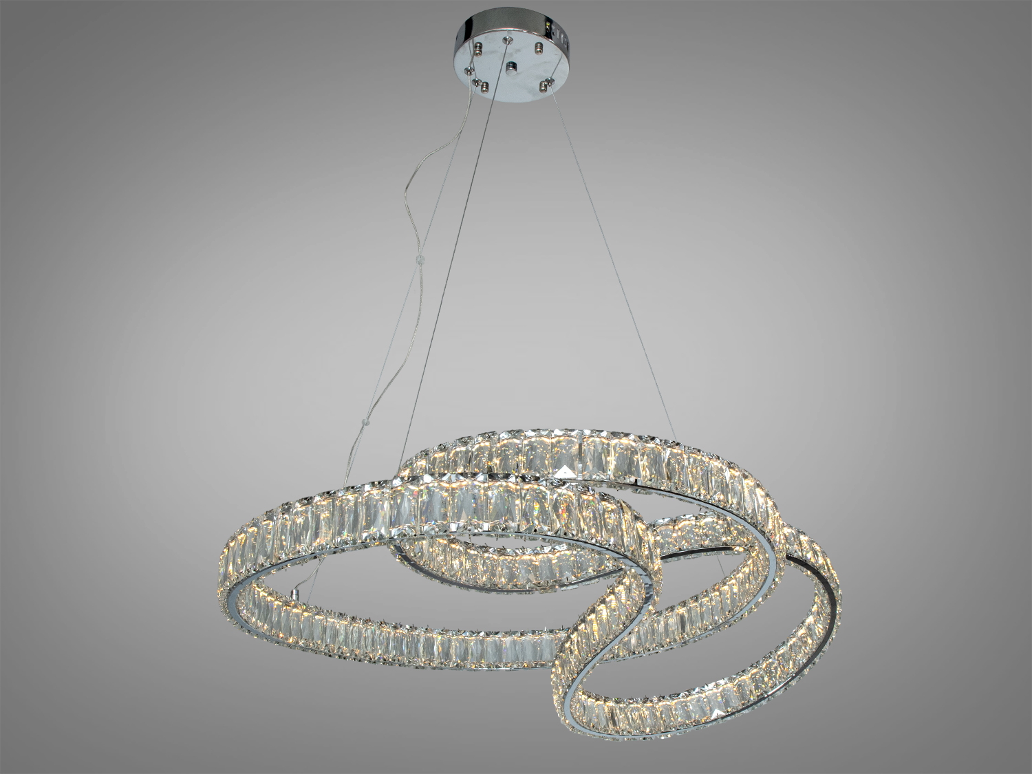 Люстра складається зі спіральних кілець, інкрустованих прозорими кришталевими вставками, що створюють багатовимірний світловий ефект. Металевий каркас гарантує міцність і надійність конструкції, а кришталь підсилює відблиски, додаючи глибину світлу. Підвіс на сталевих тросах дозволяє регулювати висоту монтажу, адаптуючи люстру під конкретний простір.