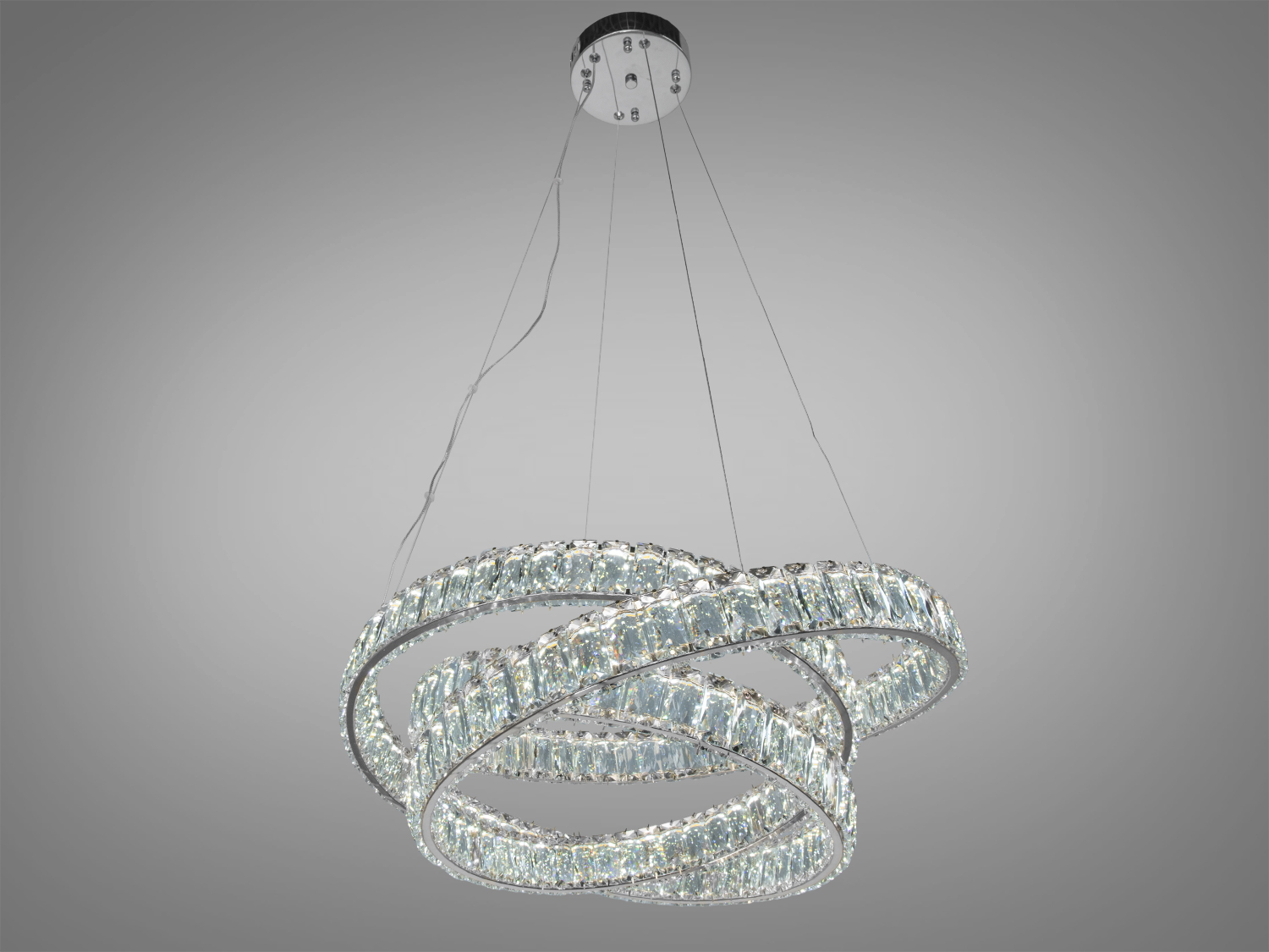 Металева основа з золотистим покриттям надає теплий відтінок світлу, підсилюючи відчуття затишку. Кришталь виконує роль природного дифузора, створюючи м’які переливи та насичені відблиски, що пом’якшують яскравість. Підвіс на тросах додає візуальної легкості, ніби люстра «плаває» у просторі.