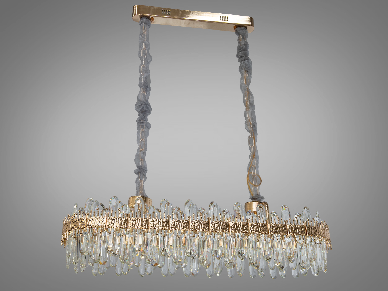 Основа люстри, з її золотистим відливом, надає їй вигляду, який одночасно і класичний, і сучасний. Криштали, що рясно прикрашають люстру, мають однакові форми — довгі елегантні струмені, кожен з яких ідеально відшліфований для того, щоб ловити і відбивати світло від світлодіодних ламп.
