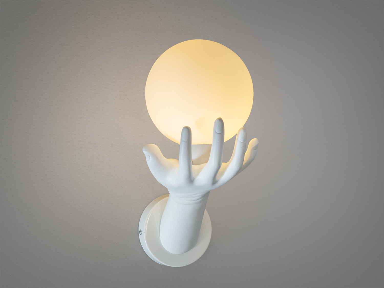 Матовий скляний плафон у формі кулі м'яко розсіює світло, створюючи затишну та розслаблюючу атмосферу. Підтримуваний вишуканою "рукою", він ніби ширяє в повітрі, стаючи символом гармонії та витонченості.