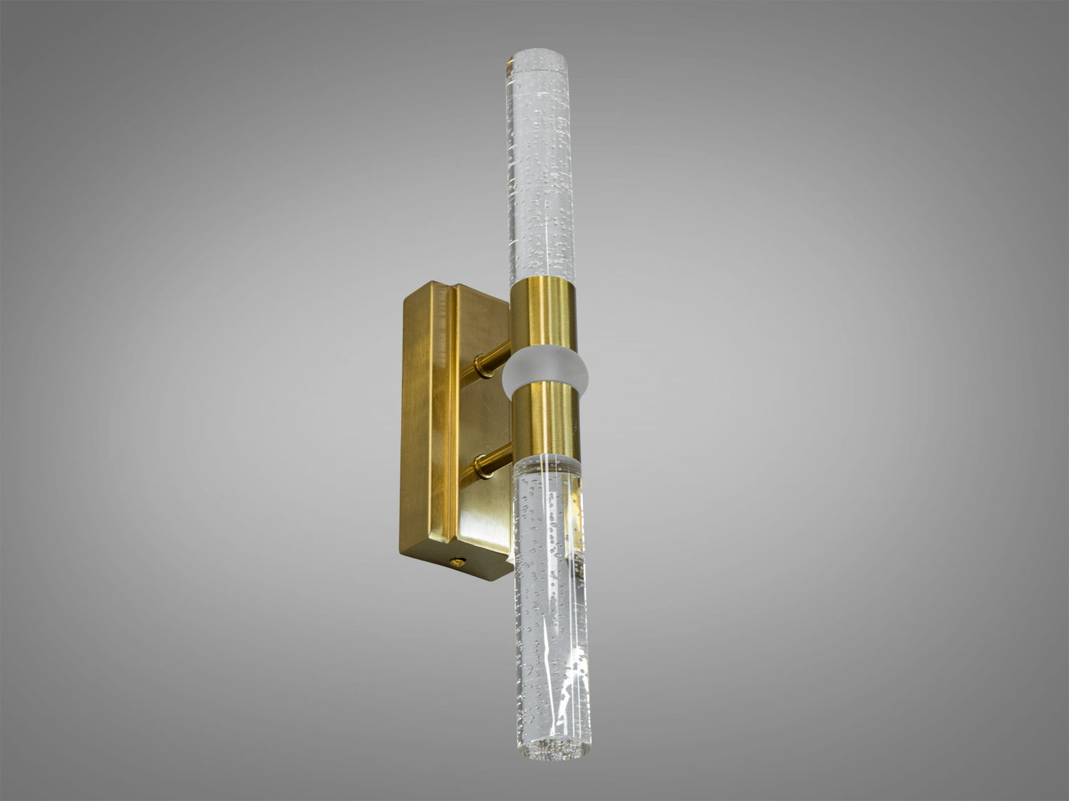 Форма бра являє собою строгу вертикальну композицію з двома циліндрами, які здаються невагомими завдяки прозорому склу та акуратній обробці. Металева основа в чорному кольорі додає глибини та контрасту, підкреслюючи елегантність конструкції. Світлодіодні елементи розташовані таким чином, щоб забезпечити рівномірне свічення, а вбудовані скляні елементи створюють ефект м'якого розсіювання світла.