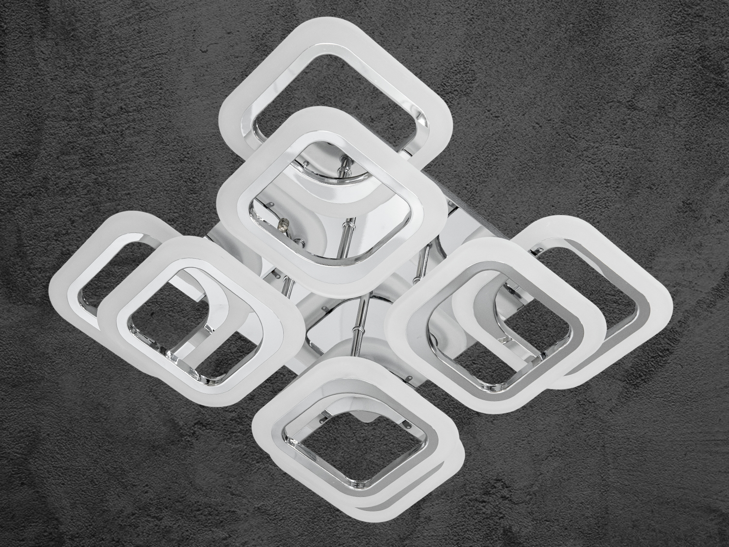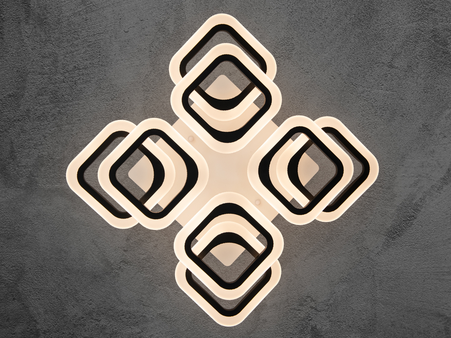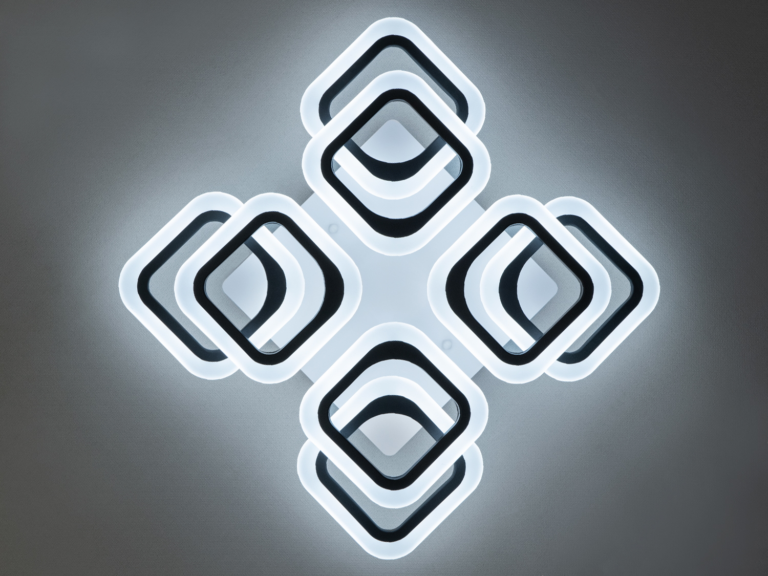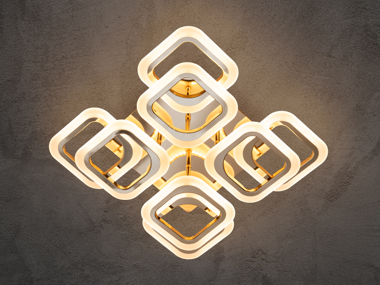 Стельова LED люстра квадратами з пультом - це геометрична симфонія світла, в якій суворі форми поєднуються з пластичністю візуального сприйняття. Її основа — це вісім світлових модулів у формі квадратів, що округляють, організованих у два рівні з легким зміщенням, що створює об'ємну багатошарову структуру, що нагадує архітектурний елемент у сучасному інтер'єрі.