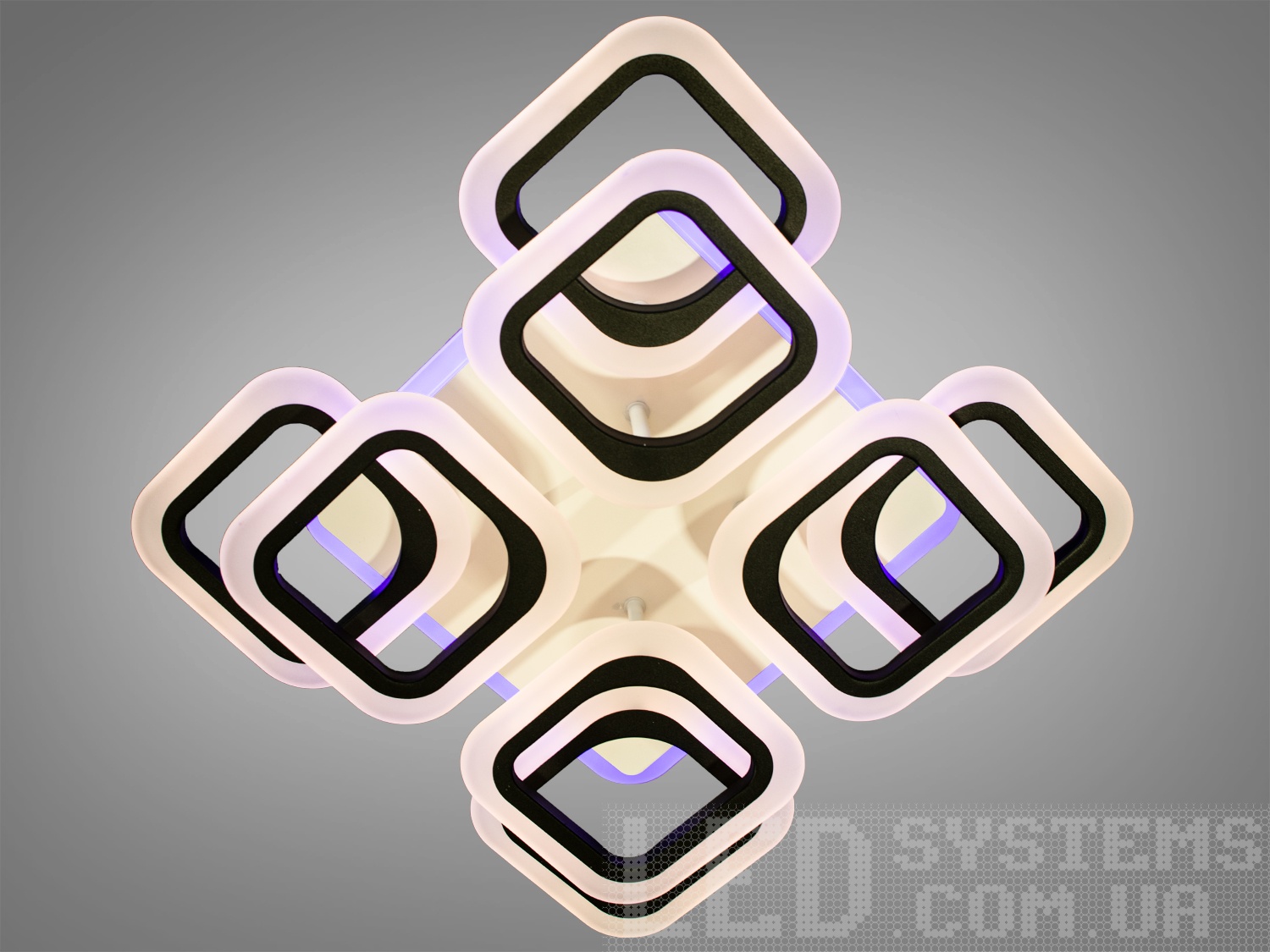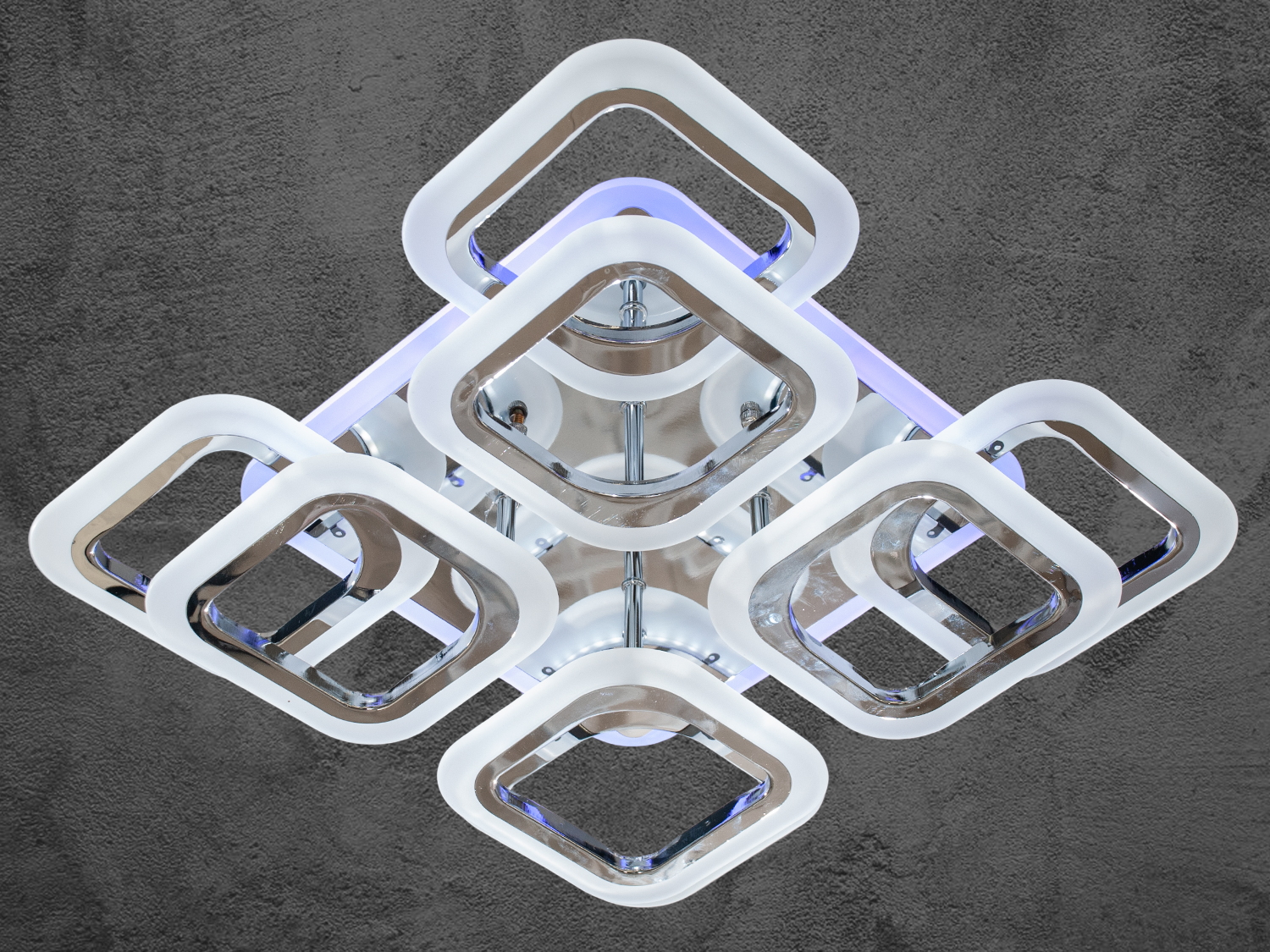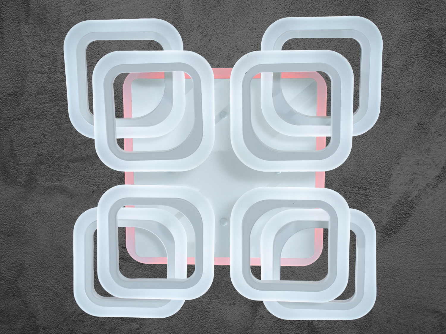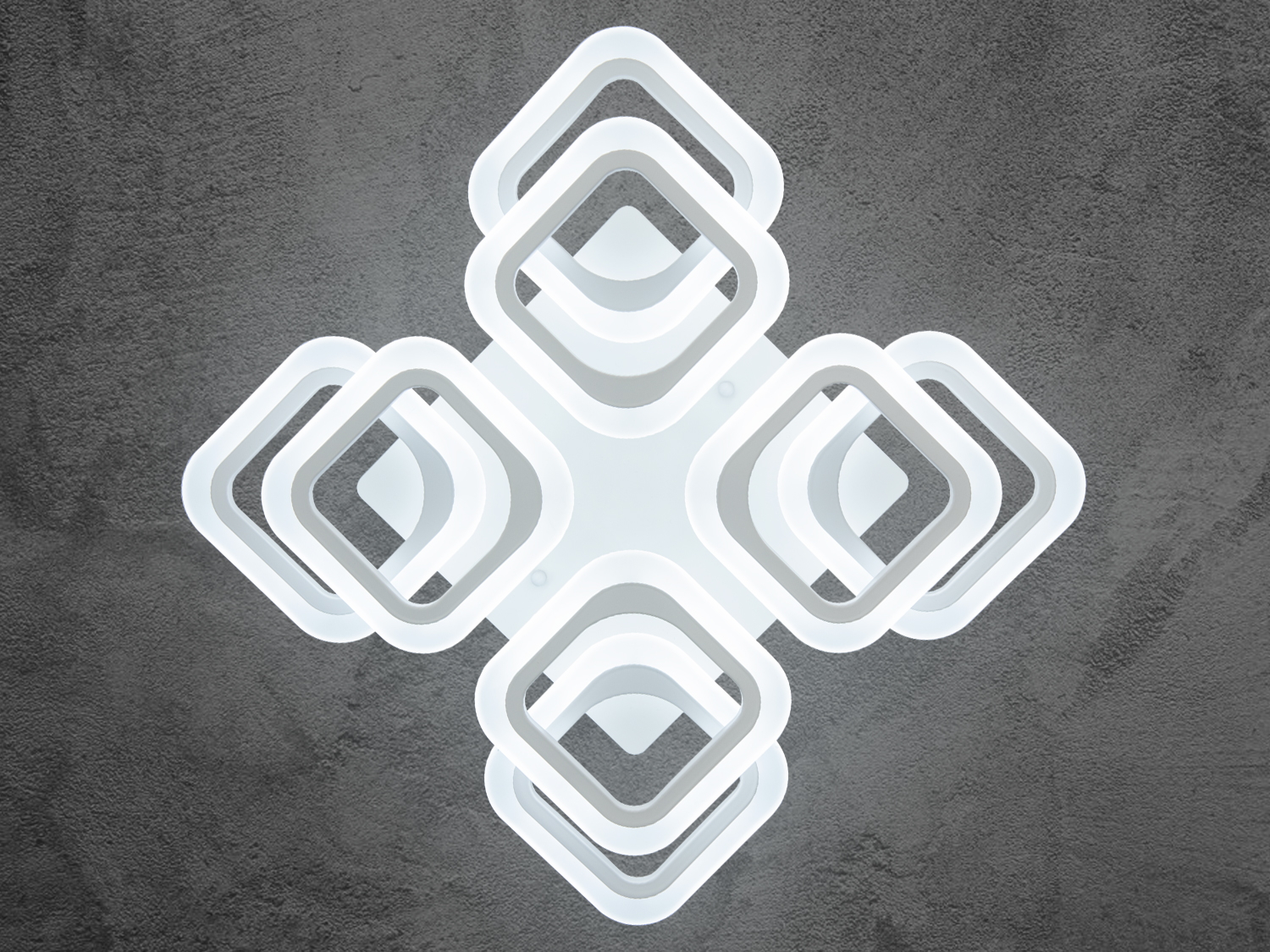 Стельова LED люстра квадратами з пультом - це геометрична симфонія світла, в якій суворі форми поєднуються з пластичністю візуального сприйняття. Її основа — це вісім світлових модулів у формі квадратів, що округляють, організованих у два рівні з легким зміщенням, що створює об'ємну багатошарову структуру, що нагадує архітектурний елемент у сучасному інтер'єрі.