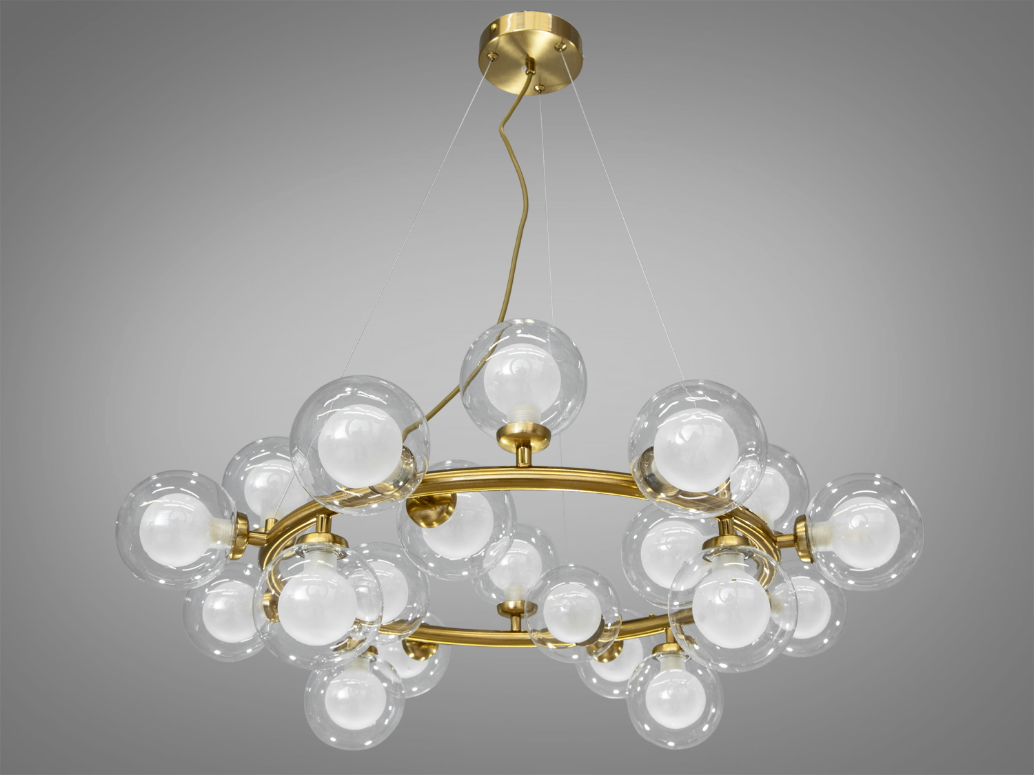 Підвісна люстра для зали відома під назвою "Бульбашки", являє собою сучасний витвір мистецтва, який перетворить будь-яке приміщення. Її унікальні плафони виконані з прозорого скла з матовим покриттям усередині, створюючи стильний контраст та м'яке розсіяне світло. Ця комбінація додає витонченості дизайну та забезпечує комфортне освітлення без сліпучого ефекту.