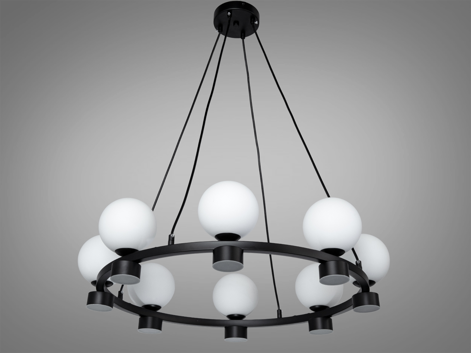 Люстра має круглі матові плафони, які створюють комфортне розсіяне світло без засліплення. Чорний металевий каркас формує чіткий графічний силует, що підкреслює стиль лофт і мінімалізм. LED-джерела світла доповнюють основне освітлення, забезпечуючи рівномірне заповнення простору.