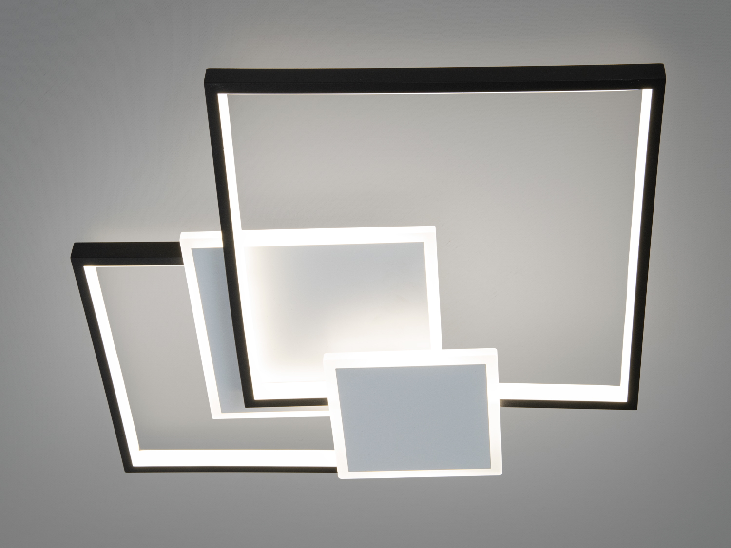 Ця модель LED люстри MX2250-3 поєднує сучасний геометричний дизайн із функціональністю високої потужності 100 Вт. Конструкція складається з чотирьох квадратних рамок різного розміру, виконаних у контрастному поєднанні білого та чорного кольорів. Така архітектура створює об′ємний силует, який рівномірно розсіює світло, забезпечуючи комфортне освітлення в кімнатах площею близько 12-20 м².