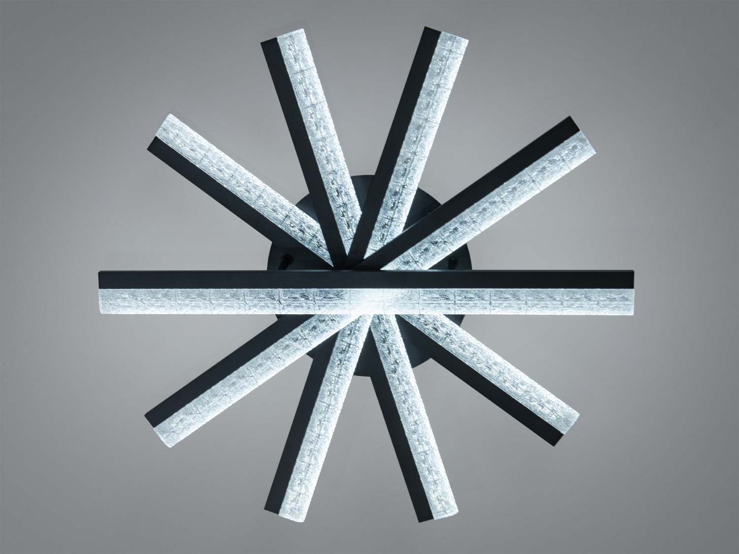 Diasha MX3068-4BK — це стельова LED люстра з потужністю 57 Вт у чорному кольорі, що поєднує сучасний геометричний дизайн із функціональністю. Конструкція складається з перехресних чорних планок із акриловими лінійними розсіювачами, які створюють рівномірний і м’який світловий потік без різких тіней.