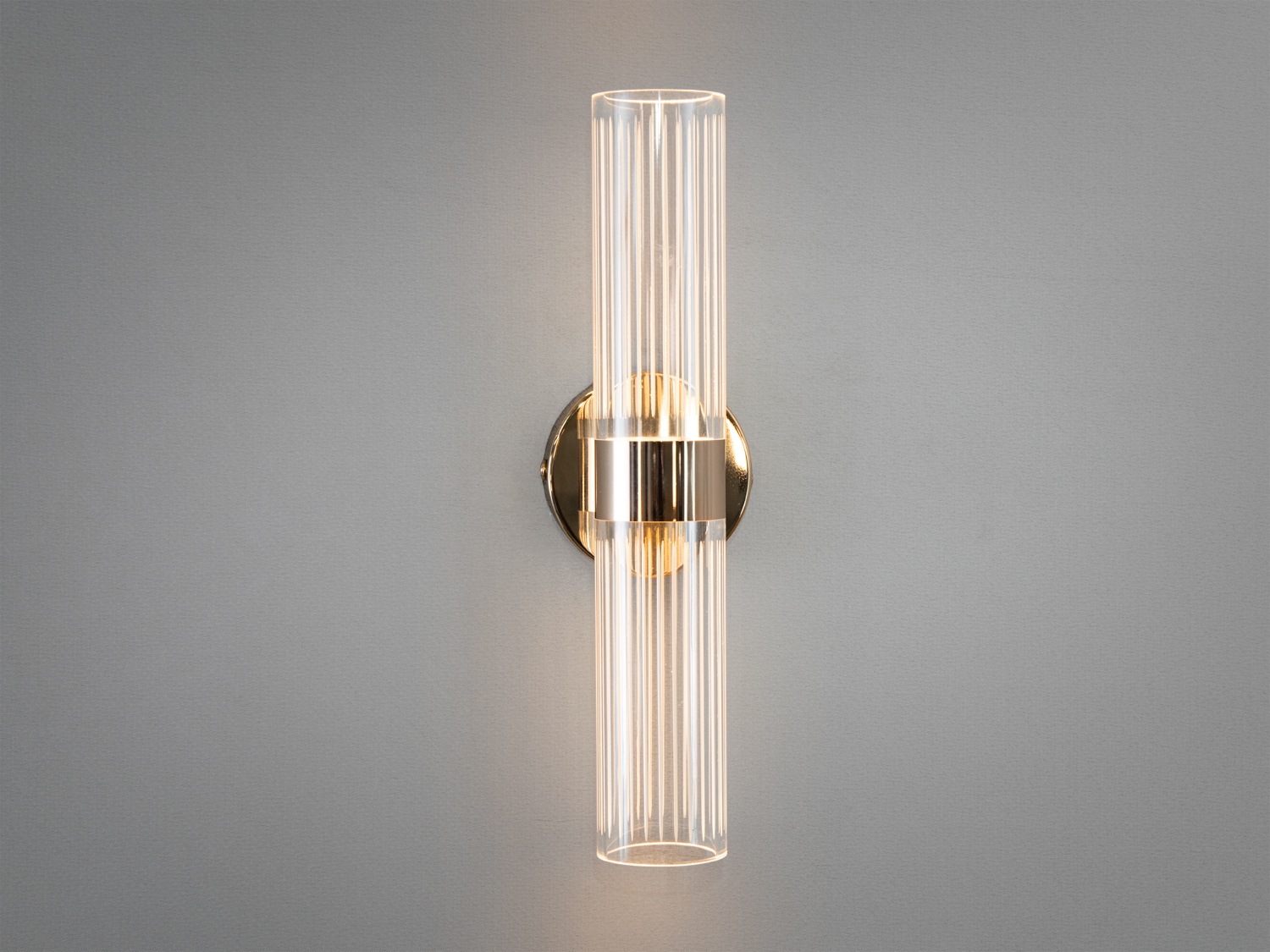 Світильник має циліндричний плафон з прозорого скла з тонкими вертикальними рельєфами, які створюють вишукану гру світла і тіні. Основа виконана в благородному золотому відтінку із дзеркальним блиском, що додає нотку розкоші та затишку.