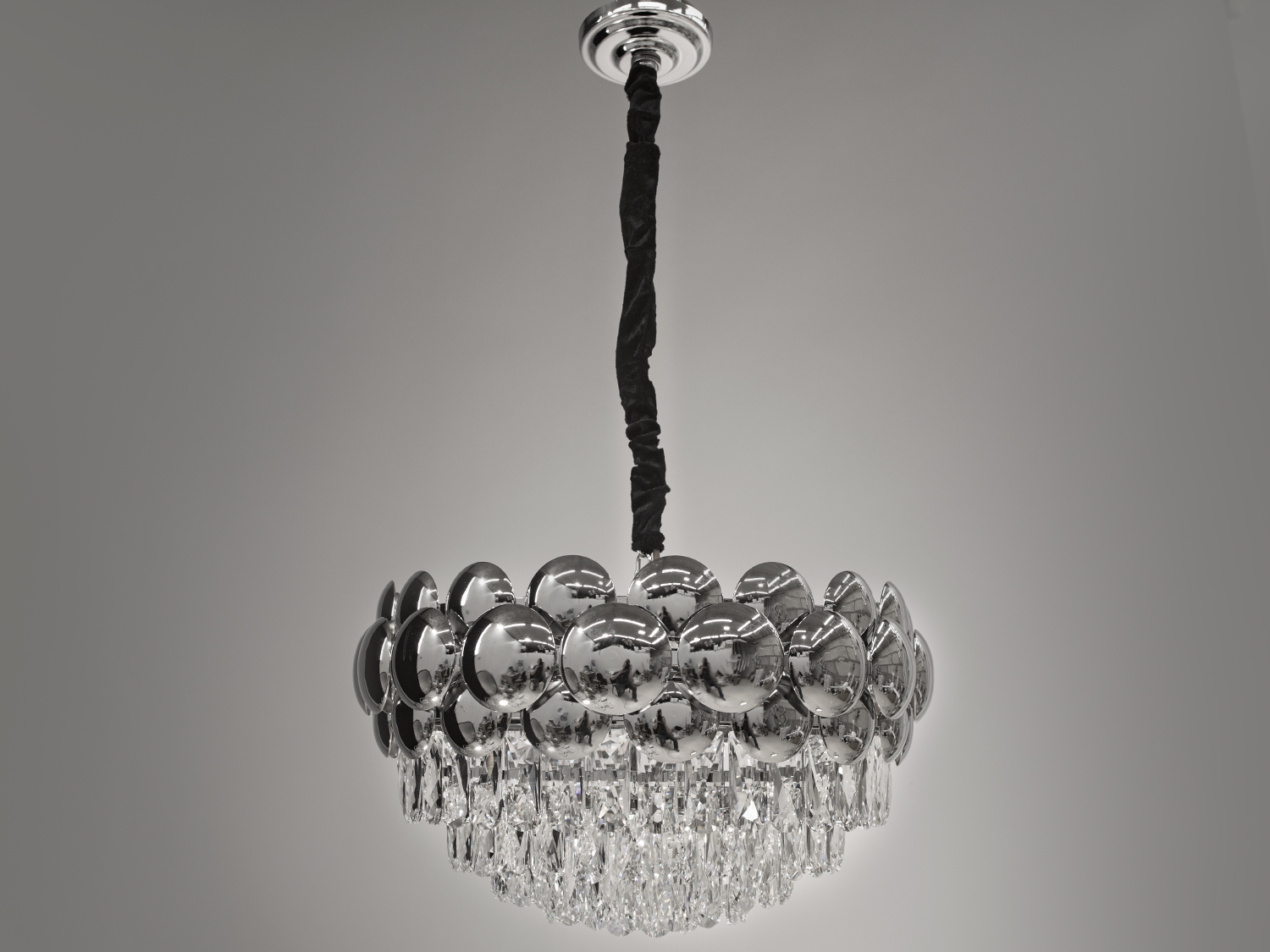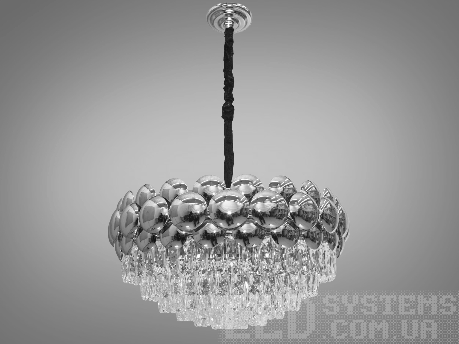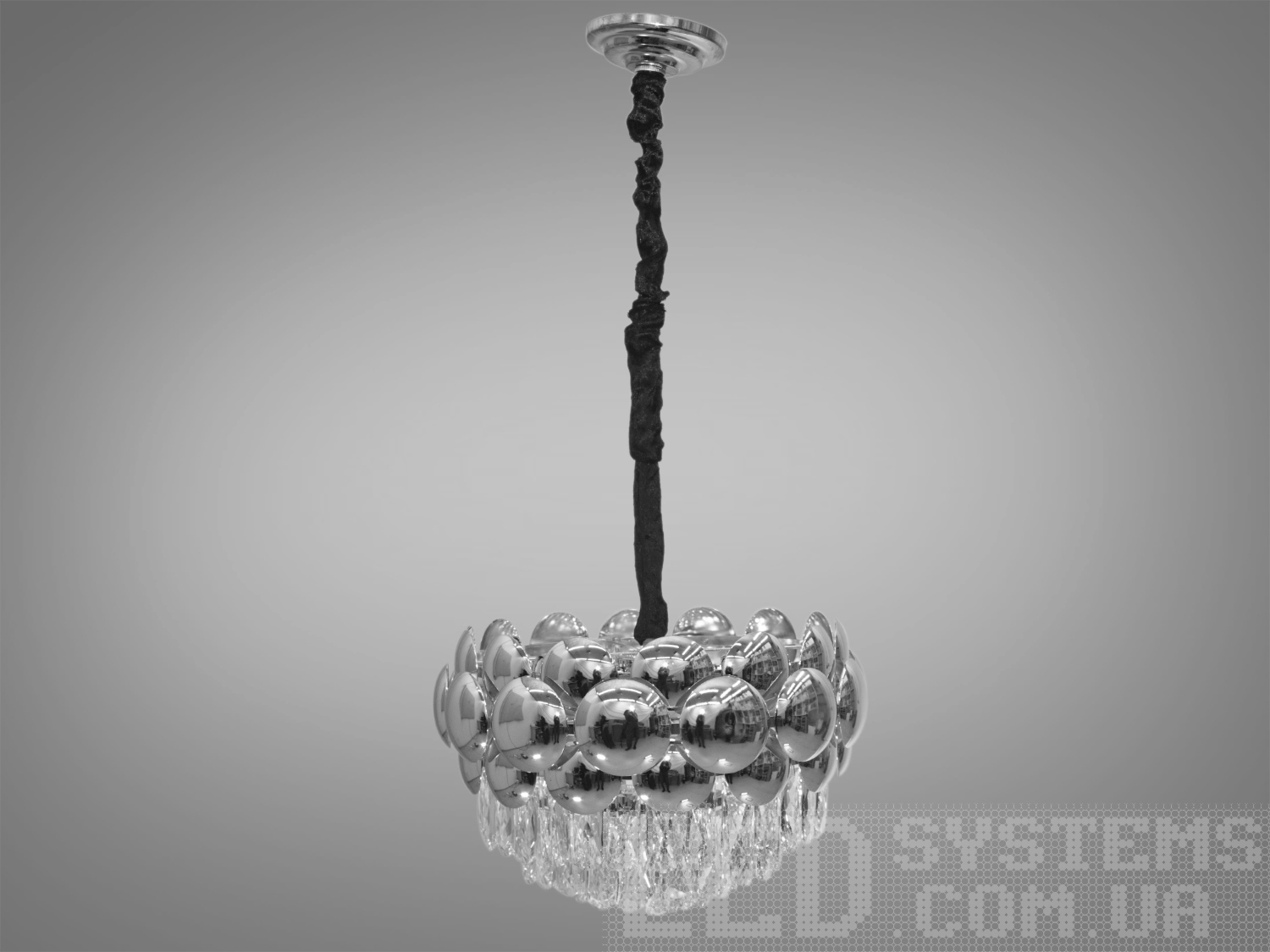 З його металевою основою, блискучою як дзеркало, та рядами прозорих кришталів, світильник випромінює мерехтливе та іскрите світло, створюючи атмосферу елегантності та святковості. Кристали різного розміру, розташовані навколо лампочок цоколь Е14, немов танцюють у ритмі відблисків та променів, що виходять з їхнього центру.
