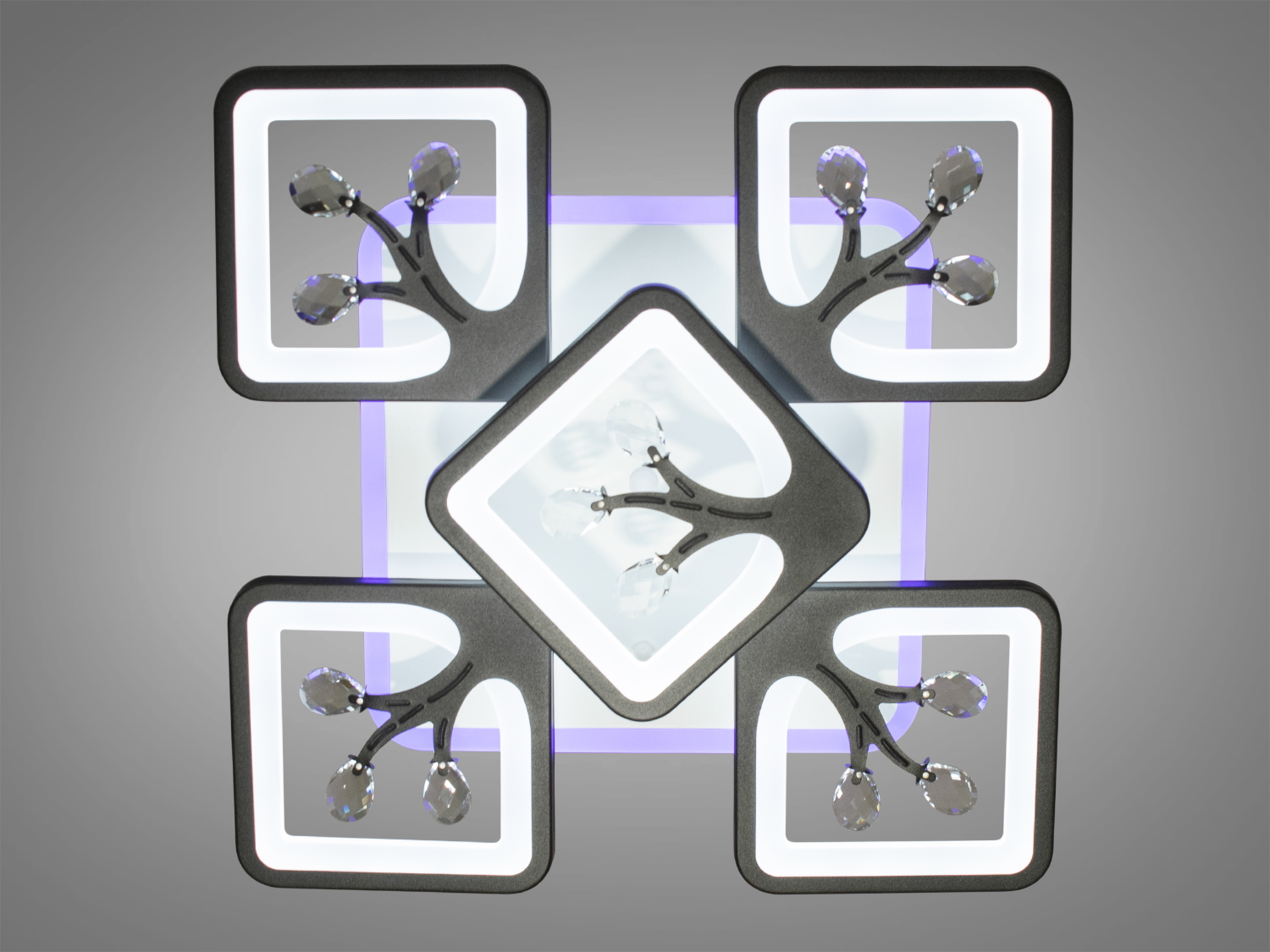 Світлодіодна люстра має кілька режимів: холодний 6000К, нейтральний 4100К, теплий 3200К, кольорове підсвічування, суміщений режим – будь-яке основне світло плюс будь-який колір світлодіодного підсвічування. Регулювання яскравості люстри від 5 до 100% відбувається за допомогою пульта дистанційного керування, що входить до комплекту.