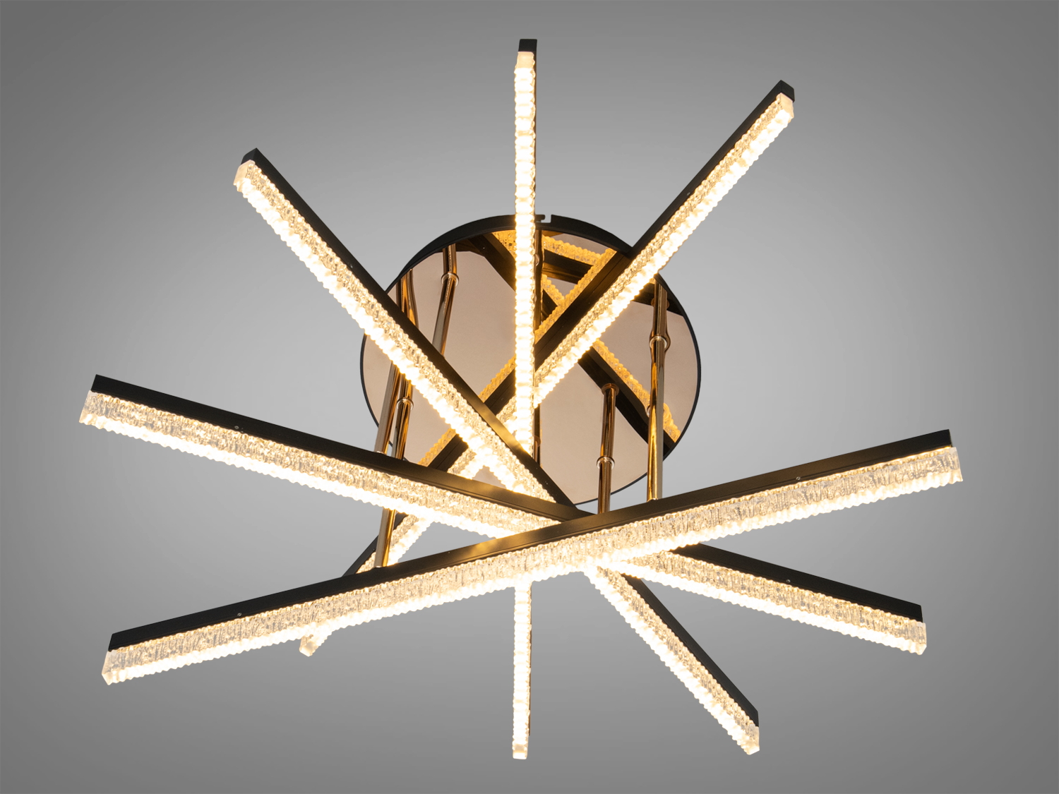 Люстра має лаконічну геометричну форму з чорним металевим корпусом та прозорими акриловими розсіювачами, які пом′якшують світло, роблячи його рівномірним і комфортним для очей. Низький профіль моделі ідеально підходить для приміщень із невисокими стелями, не перевантажуючи простір.