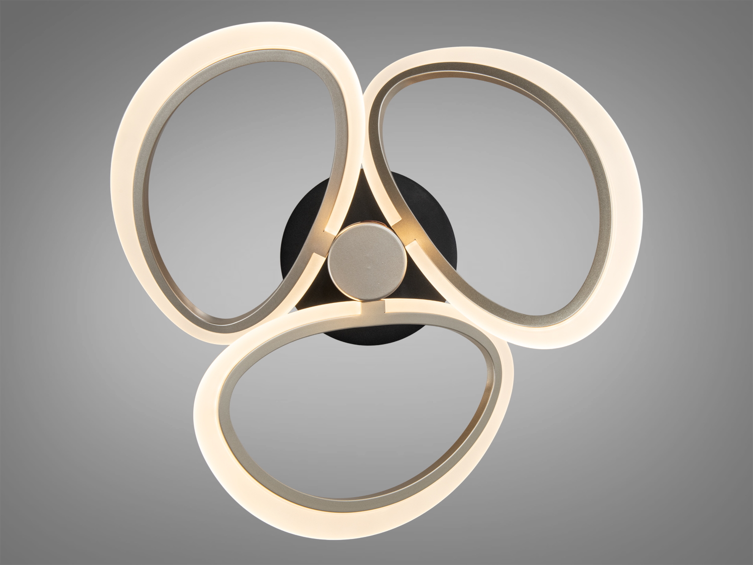 Люстра складається з трьох квадратних LED-контурів, що утворюють композицію, схожу на стилізовану квітку. Плавні лінії і перетини квадратів додають об′єму та візуальної виразності. Низький профіль моделі підходить для приміщень зі стандартною висотою стелі.