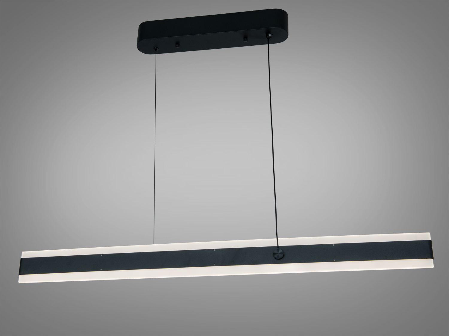 Чорний металевий корпус поєднується з прозорим акриловим розсіювачем з кришталевою фактурою, що пом′якшує світло і зменшує відблиски, створюючи глибокий, структурований світловий ефект. Витягнута геометрія люстри дозволяє рівномірно висвітлювати лінійні поверхні, такі як стільниці чи полиці.