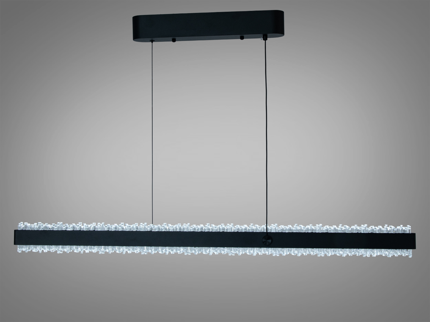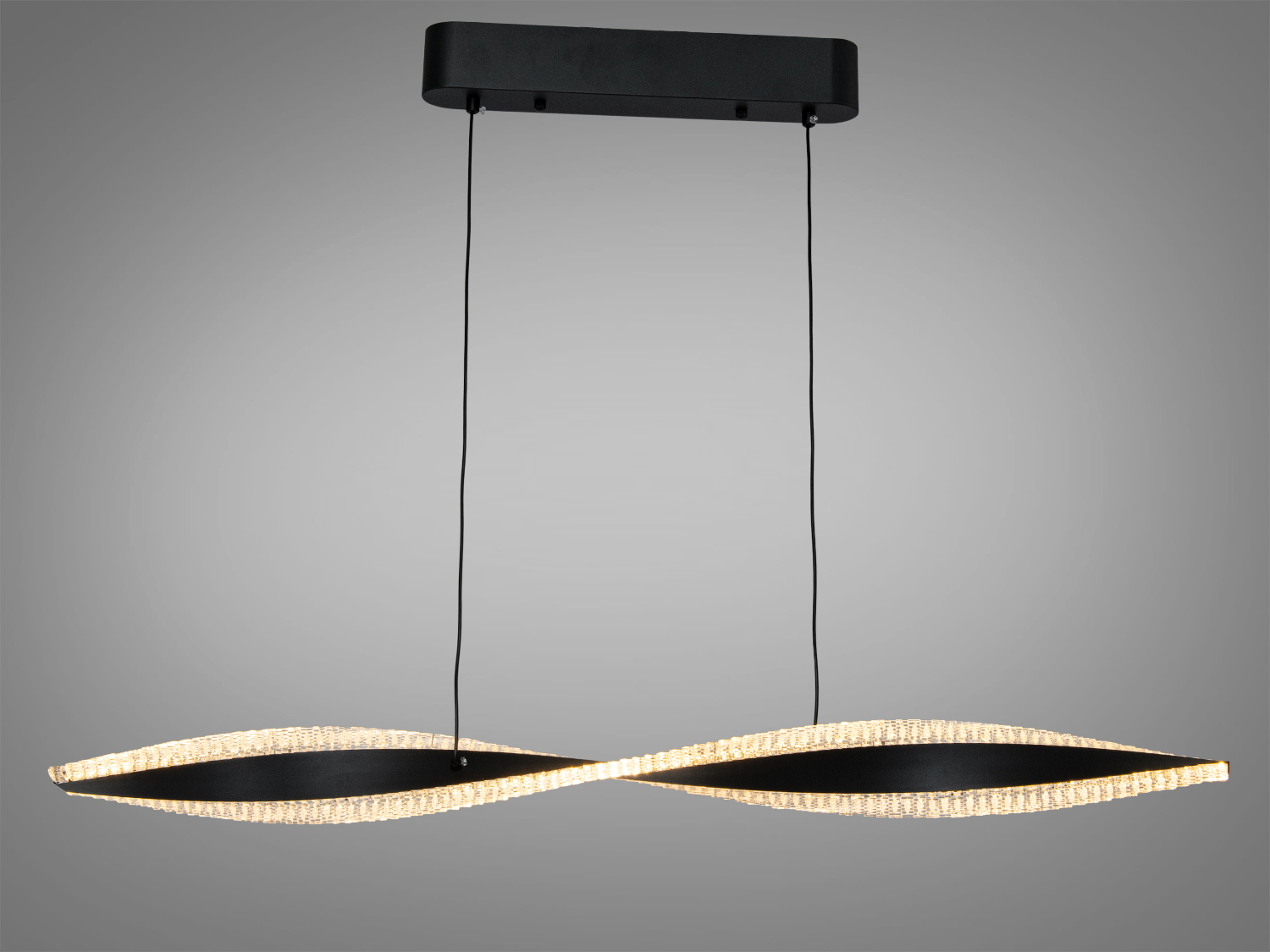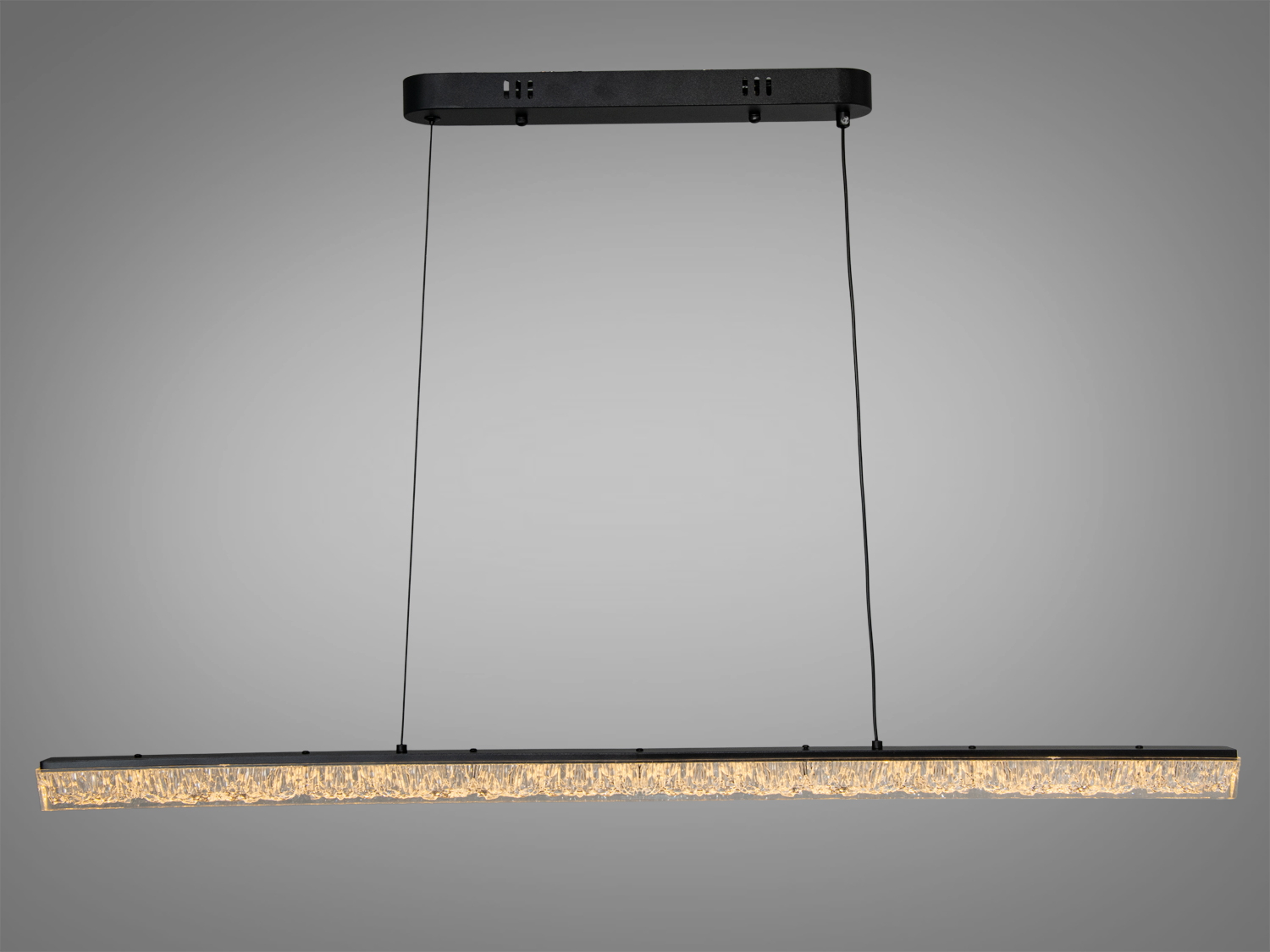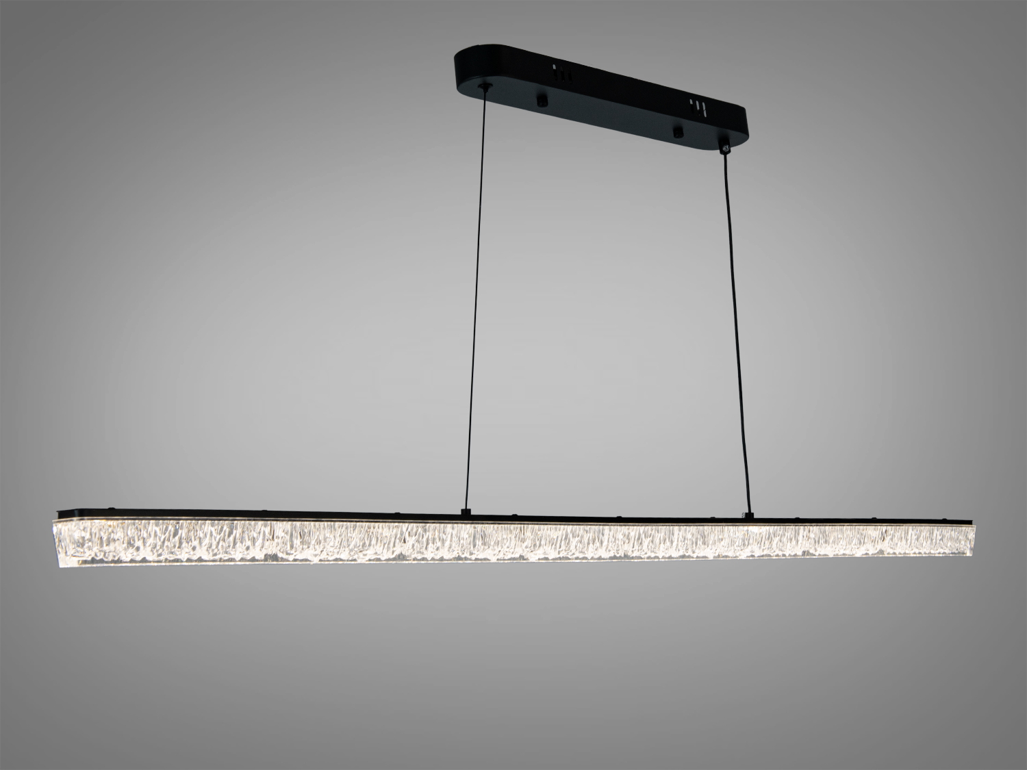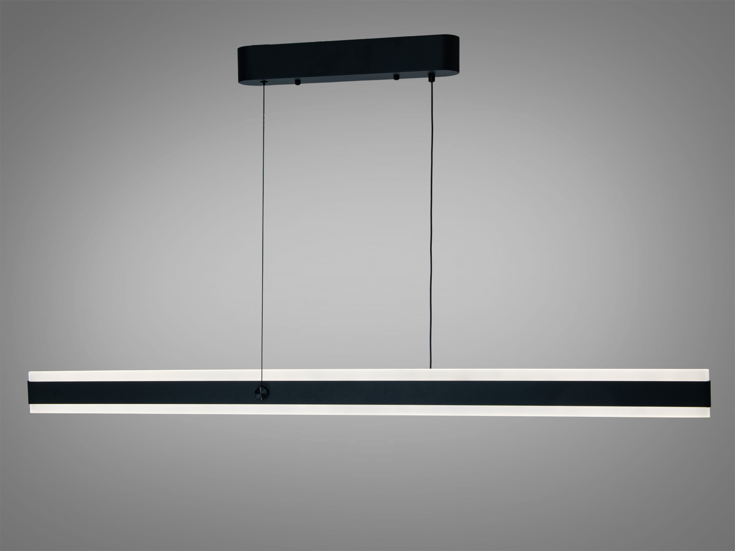 Лінійна форма світильника формує світлову смугу, яка акцентує простір робочої поверхні або зони відпочинку. Матовий чорний корпус додає стриманості та гармонійно вписується у сучасні інтер′єри з темними відтінками. Підвіс на двох тонких тросах візуально «полегшує» конструкцію, роблячи її максимально лаконічною.