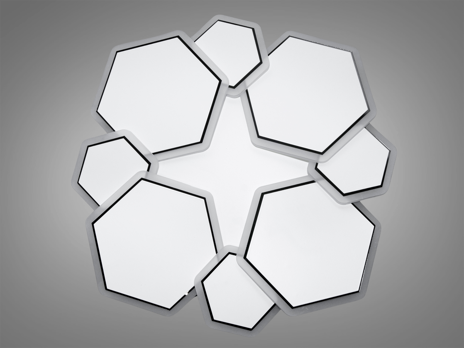 Світильник зі своїм сучасним дизайном, що нагадує мінімалістичний арт-об'єкт, одразу привертає увагу своєю унікальною світлодіодною панеллю. Він ніби складений із геометричних фрагментів світла, що зливаються в єдине ціле. М'яке сяйво, що випромінюється навколо його обрисів, надає кожному променю відчуття метафізичної теплоти та легкості, що розчиняє межі між реальним та уявним.
